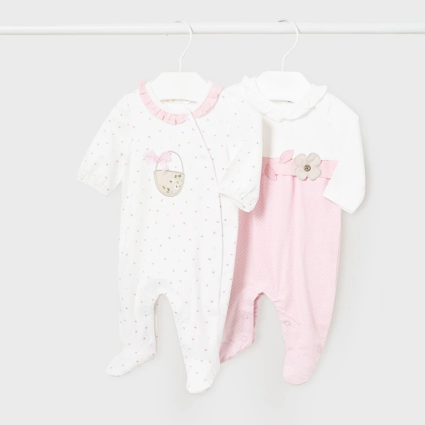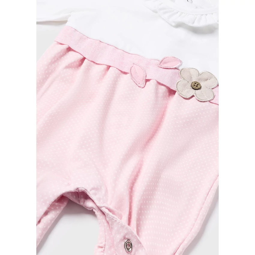 Mayoral csodaszép virágos-pöttyös 2 darabos rugdalózó szett, ami egy fehér apró pöttyös elöl patentos galléros rugdalózóból áll masnival díszítve elöl, és egy fehér-rózsaszín hátán patentos derekán virággal díszített rugdalózóból áll. Mindkét termék kellemes, puha és nagyon rugalmas pamutból készültek. | |