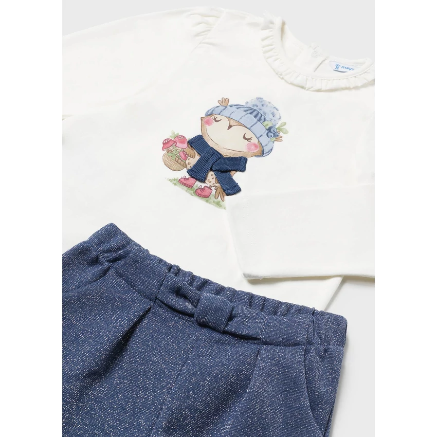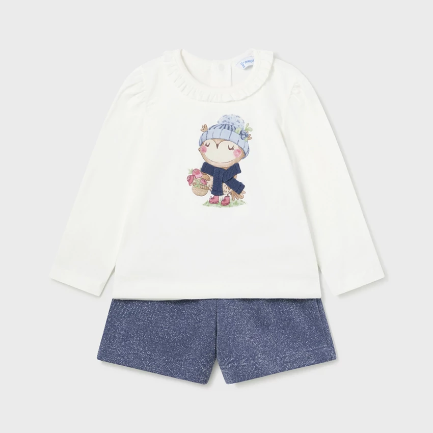 Mayoral állatka mintás felső 3D sállal díszítve, fodros nyak teszi különlegessé, nagyon rugalmas puha pamutból készült a felső. A rövidnadrág csillogó lurex hatású nagyon rugalmas anyagú, gumírozott derekú, elöl masni díszíti, egyedi szupercsinos szett őszre. | |