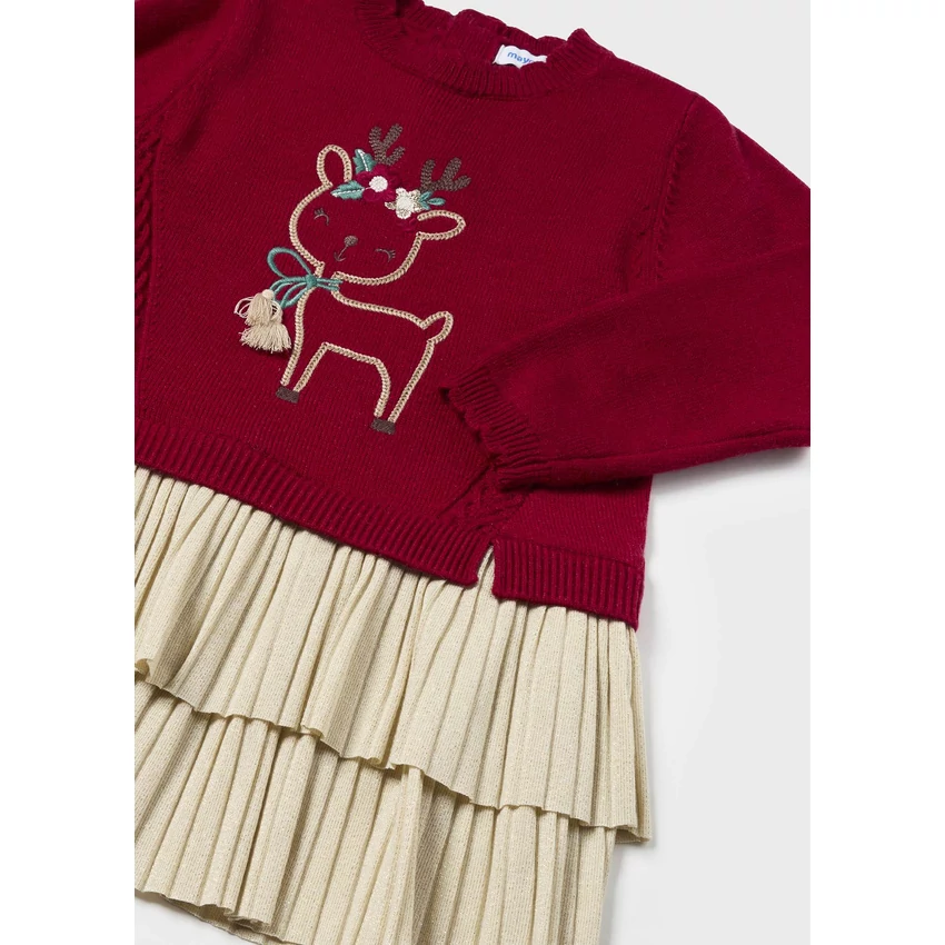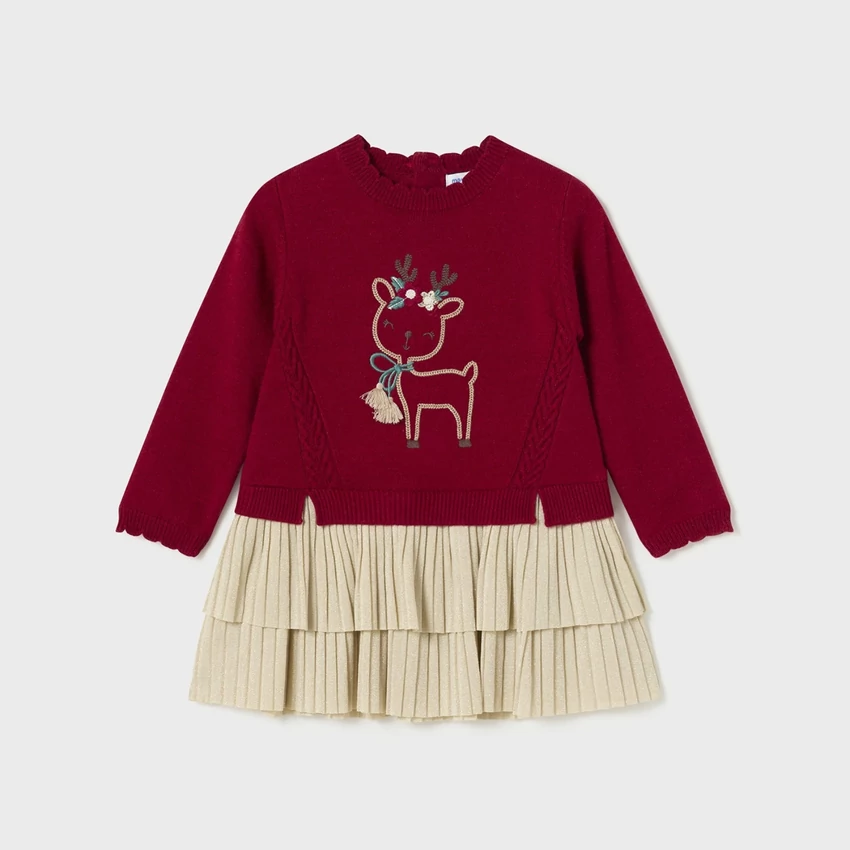 Mayoral őzikemintás egyedi ruha, a felső része finomkötött puha anyagú, a szoknya része aranyszínű finoman csillogó pliszírozott fazonnal. | |