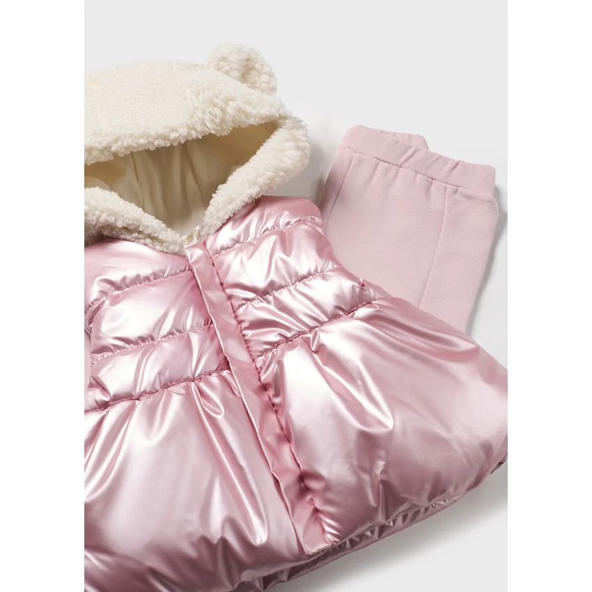 Mayoral csodaszép 3 részes fényes mellényes melegítő szett, ami egy törtfehér szőrme fülecskével díszített vastag töltetű fényes anyagú cipzáras mellényből áll, A-vonalú csinos fazonú, egy elöl fényes mintájú vékony puha pamut pulóverből, hátán patentos, és egy és rugalmas gumis derekú vékonyabb melegítőnadrágból áll, bolyhos béléssel. Nagyon egyedi extra gyönyörű termék. | |