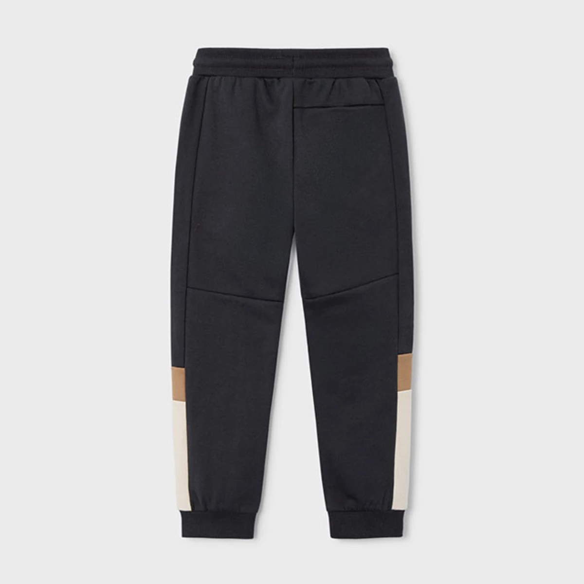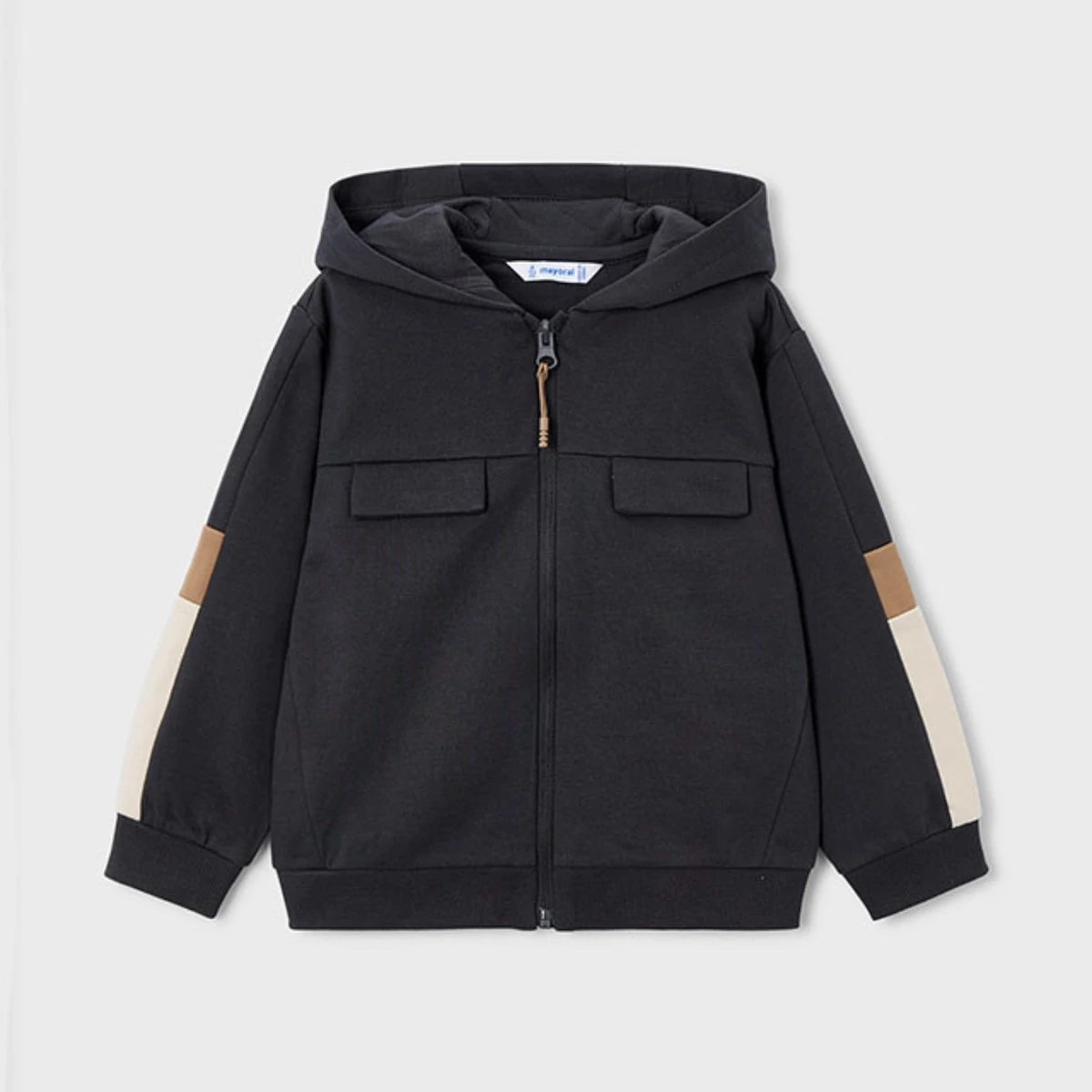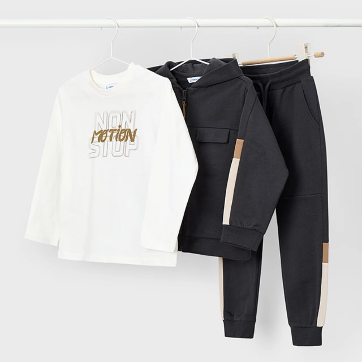 Mayoral 3 részes sportosan csinos melegítő szett, ami egy Non-stop Motion feliratos fehér hosszú ujjú felsőből, egy kapucnis-cipzáras ujján színes betéttel díszített pamut melegítő felsőből áll, elöl zsebekkel, bolyhos béléssel, és 1 gumis derekú megkötős vastagabb melegítő alsóból áll, gumírozott derékrésszel, megkötővel, zsebekkel, egyik lábszárán oldalt szintén színes betéttel díszített. belül bolyhos béléssel. Nagyon szép és kényelmes őszi-téli viselet. A melegítő színe sötét szürkésfekete, bézs-fehér betéttel.