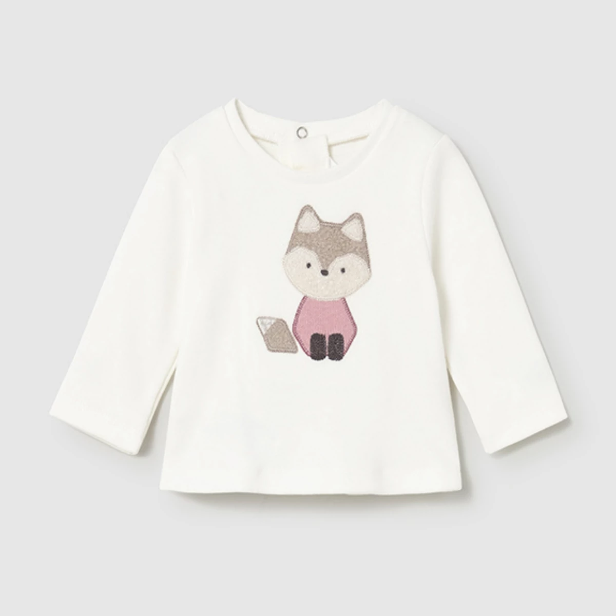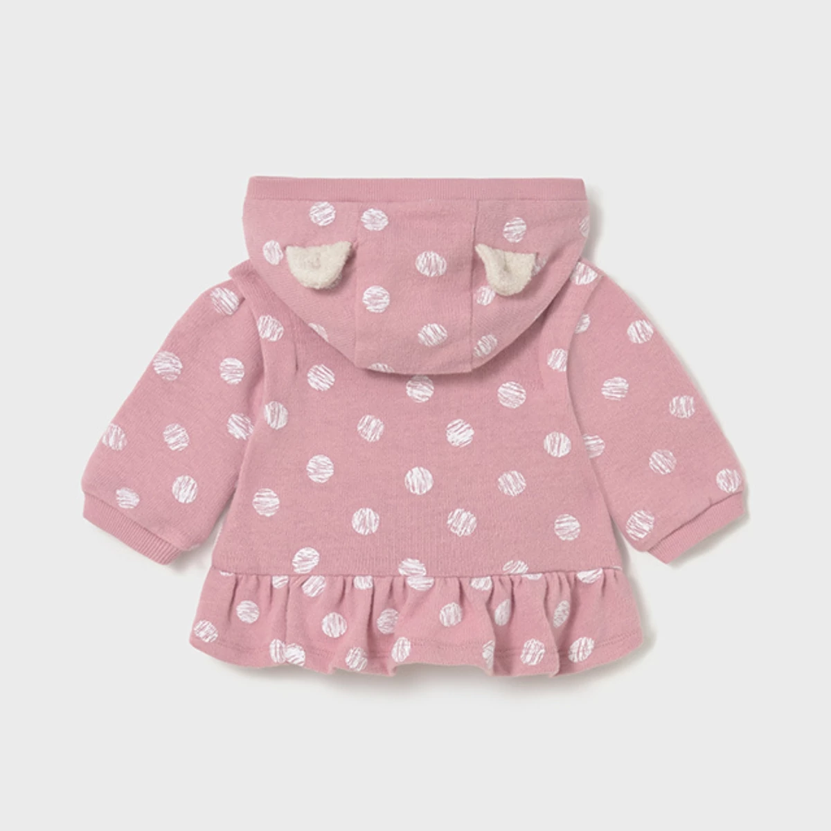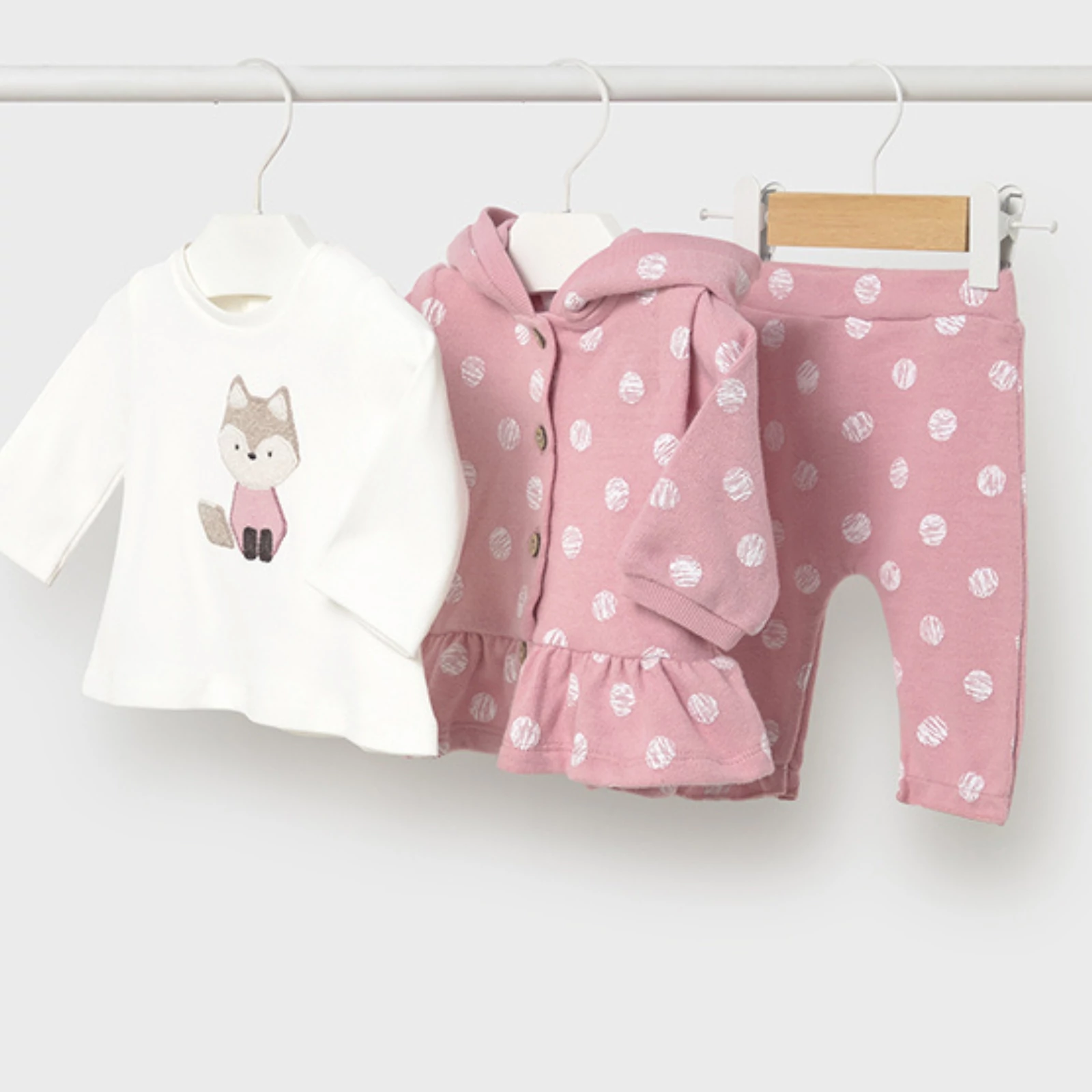 Mayoral 3 részes szett, ami egy elöl cuki rókamintás hosszú ujjú pamut felsőből áll, szőrme díszítéssel, rugalmas pamut anyagból készült, hátán patentokkal nyitható, egy vastag rugalmas pamut anyagú gombos pulóverből áll, nagyméretű pöttyökkel díszített, csinos fodros aljú fazonnal, apró fülekkel díszített kapucnival, illetve egy gumírozott derekú szintén rugalmas pamut nadrágból áll, nagyméretű pöttyökkel díszített, lábszáránál fodros gumírozott. Nagyon szép szett a legkisebbeknek.