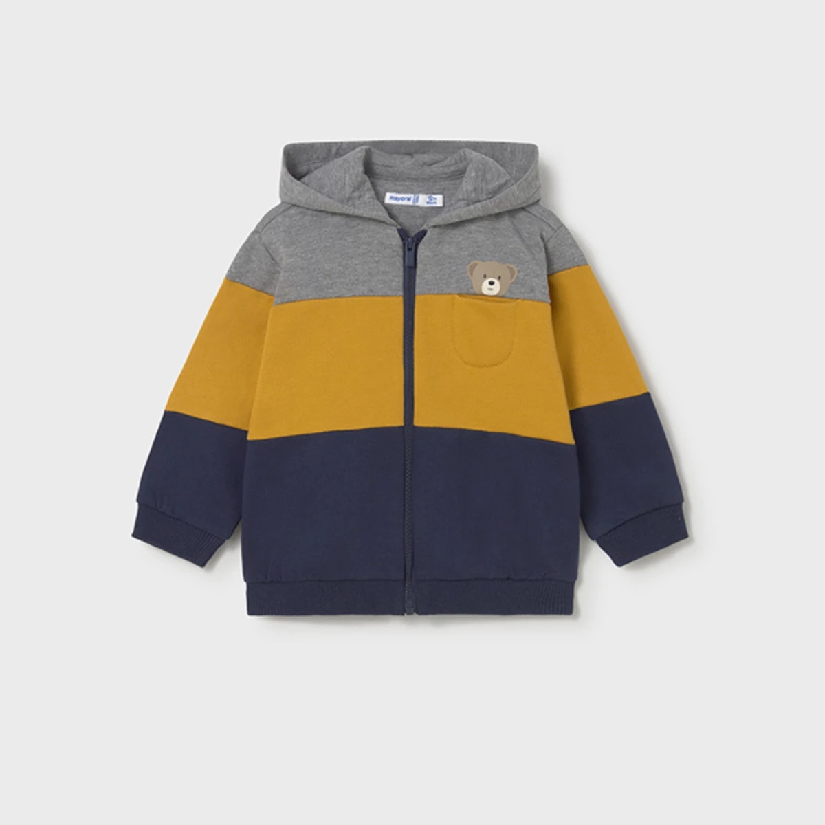 Mayoral 3 részes sportos melegítő szett, ami egy kapucnis-cipzáras mellrésznél apró macifejjel díszített pamut melegítő felsőből, cuki macifüles kapucnival, bolyhos béléssel, és 2 darab gumis derekú megkötős vastagabb melegítő alsóból áll, gumírozott derékrésszel, megkötővel belül bolyhos béléssel.