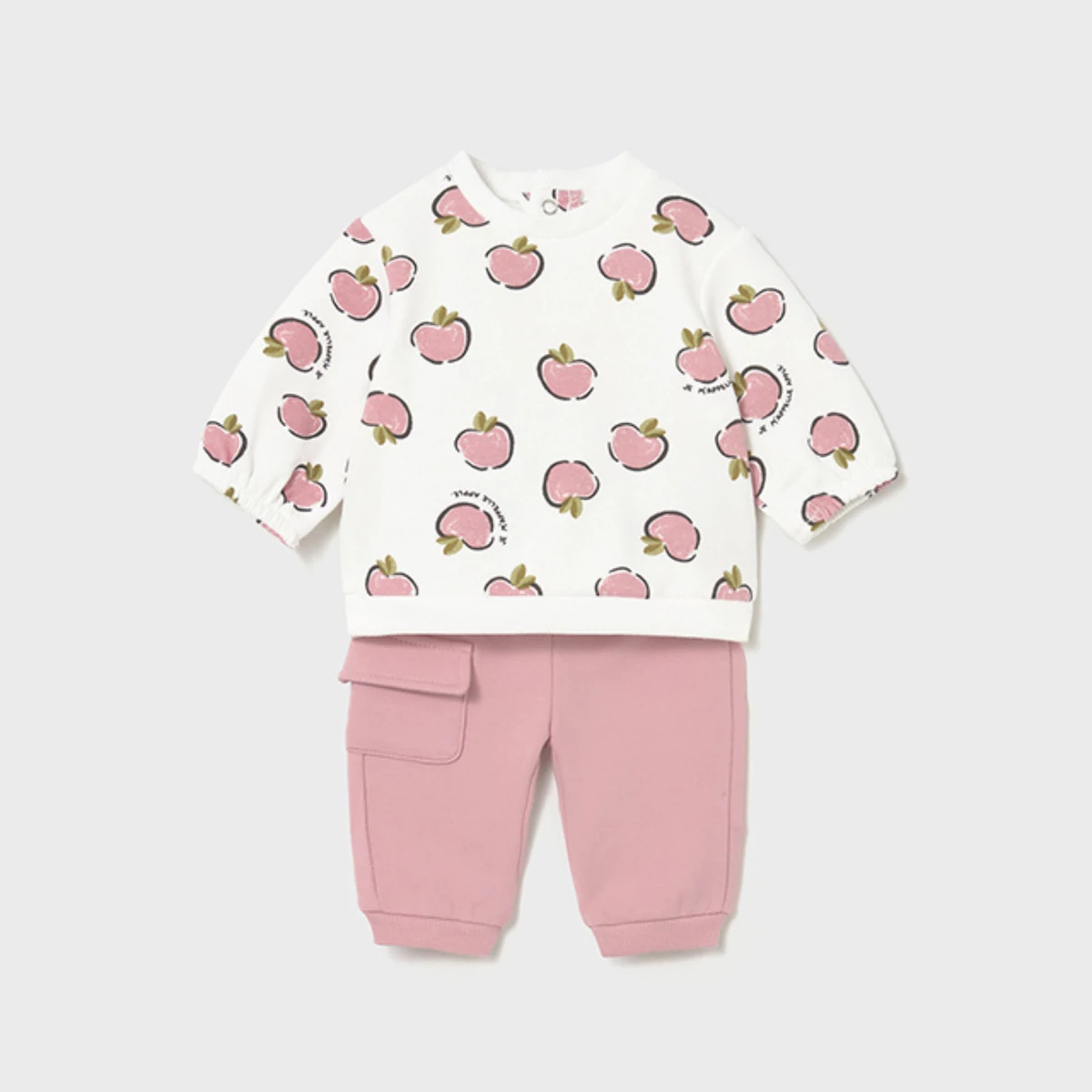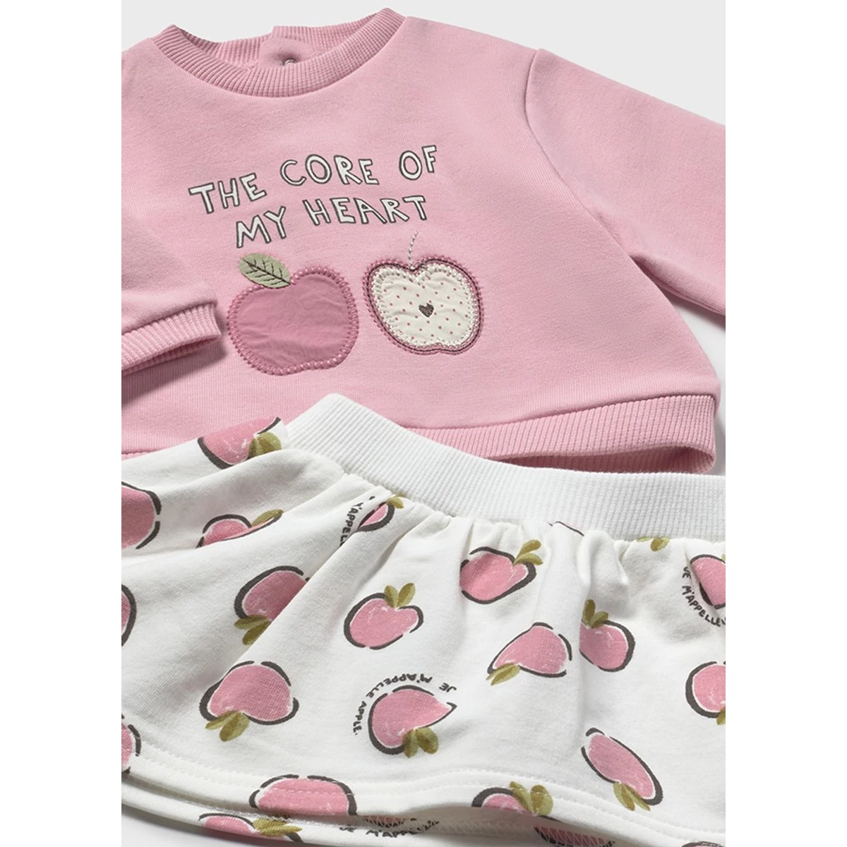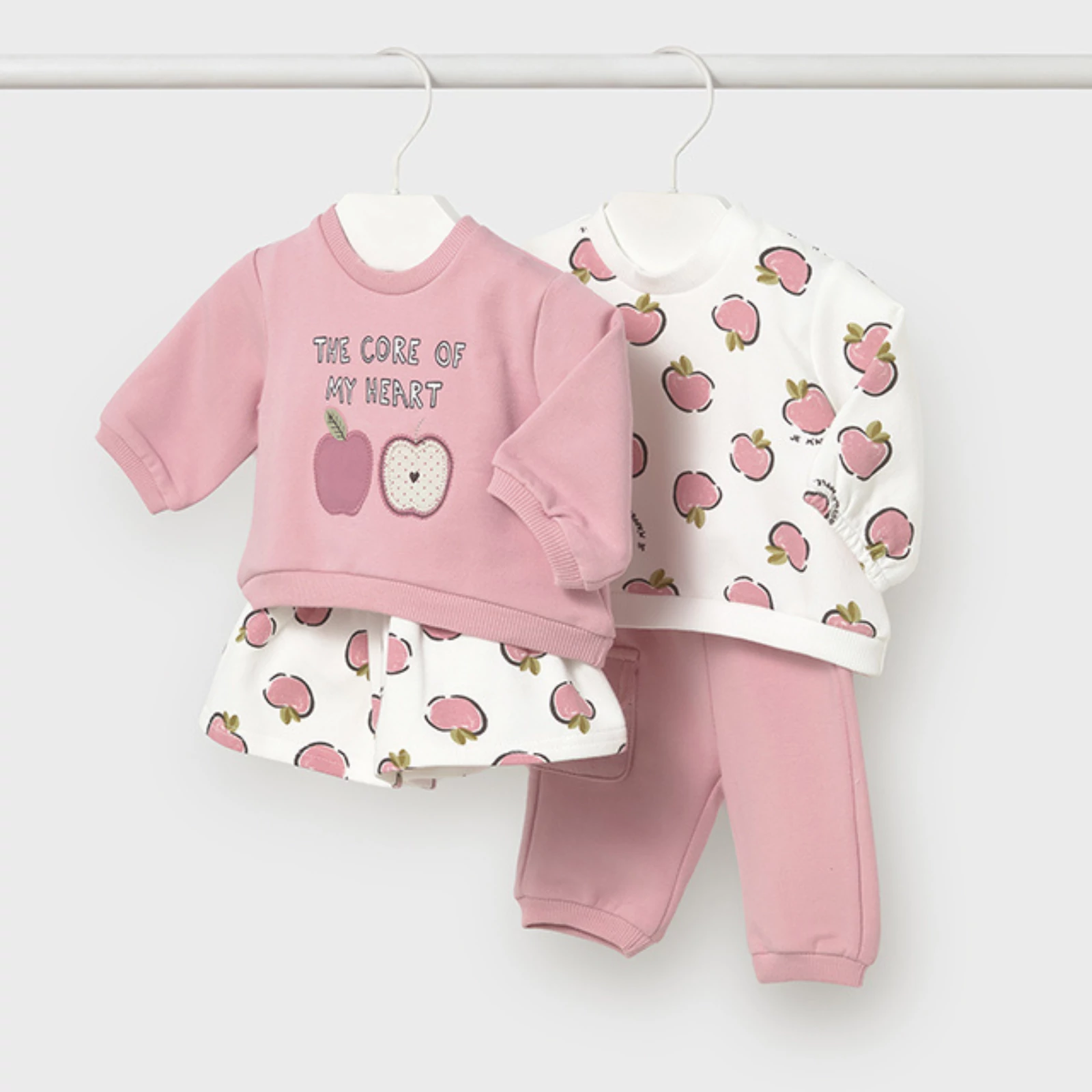 Mayoral 4 részes pamut szett, ami 2 darab rugalmas pamut pulóverből áll, egyik elöl feliratos-gyümölcsmintás, a másik végig almamintás, hátán patentos mindkettő. Illetve a szett tartalmaz egy oldalzsebes rugalmas pamut melegítőnadrágot, és egy almamintás gumis derekú rugalmas pamut kisszoknyát. Egyedi kis csinos szett a legkisebbeknek.