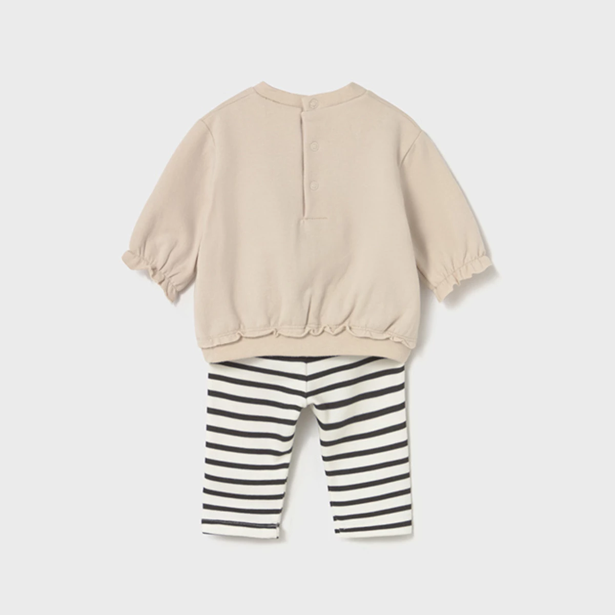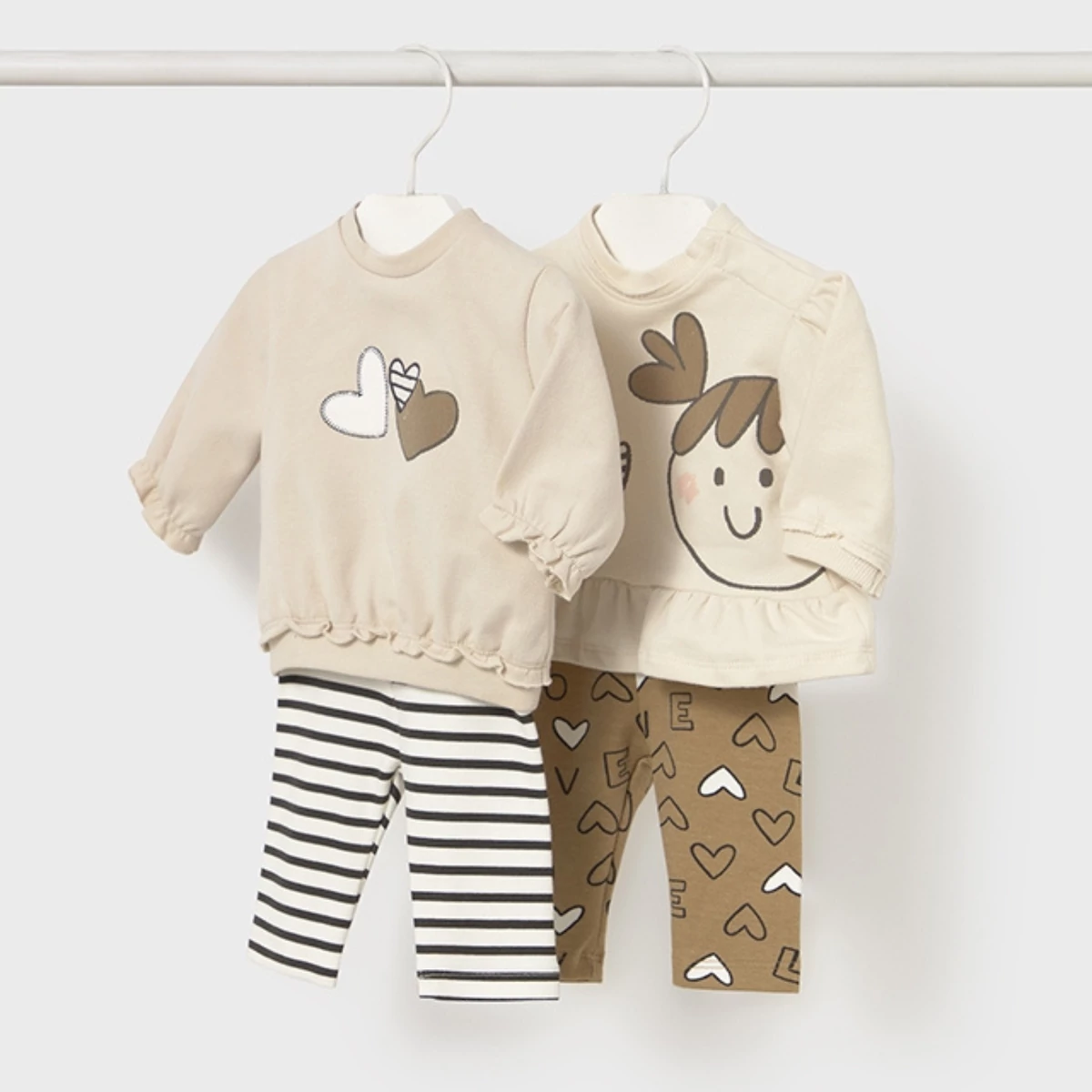 Mayoral 4 részes pamut szett, aminek része 2 darab rugalmas krémszínű pamut pulóver, az egyik szivecskemintás a hátán patentos megoldással, fodrokkal díszített, a másik kislánymintás, alján csinos fodorral, mindkettő belül bolyhos, meleg. A szett tartalmaz 2 darab extra rugalmas, derekukon díszmegkötővel ellátott, vastag téli leggingst.