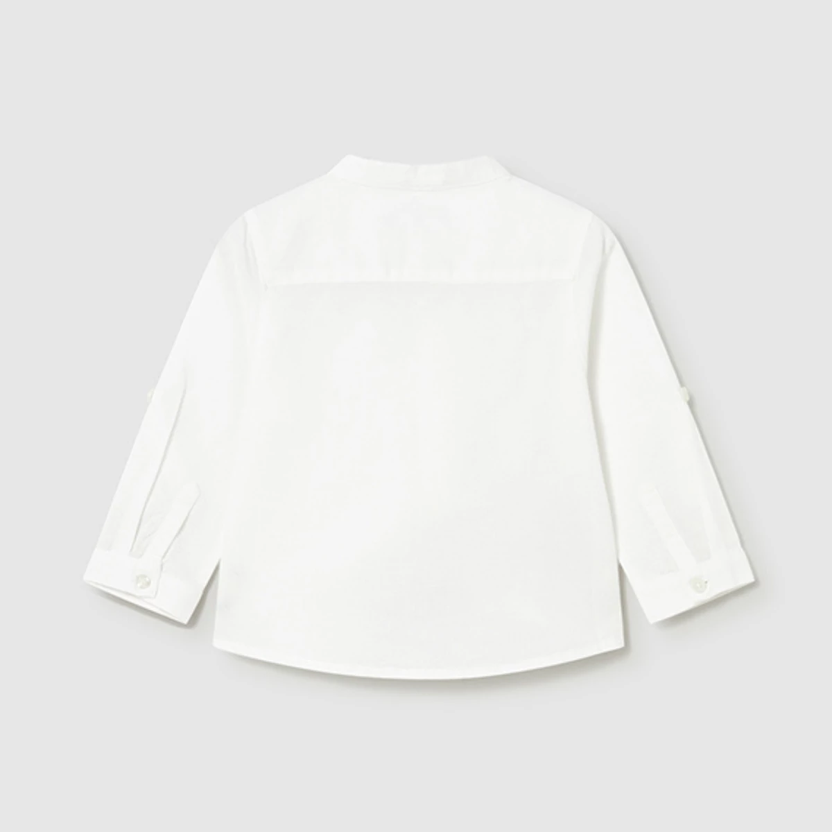 Mayoral fehér színű állógalléros csinos lenvászon ing visszagombolható ujjakkal, könnyed pamut-len anyagból készült, csinos és kényelmes tavaszi-nyári viselet.