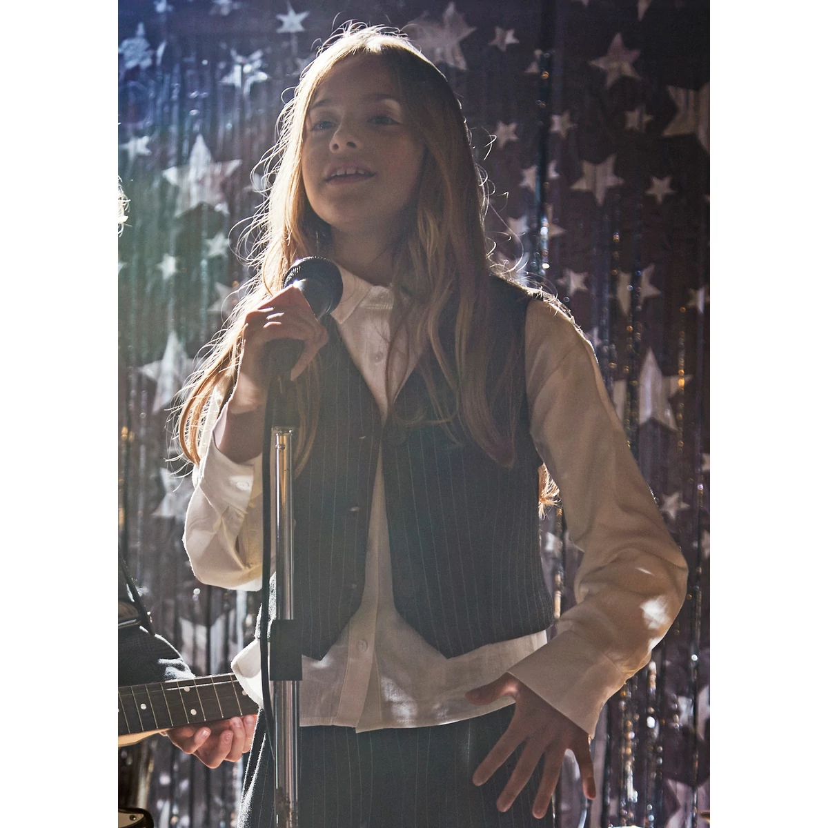 Mayoral gyönyörű szürke alapon fekete csíkozású csinos alkalmi mellény extra rugalmas anyagú, elöl végig gombos, testhezálló szűkített fazonú, ugyanilyen színű nadrág külön kapható hozzá.