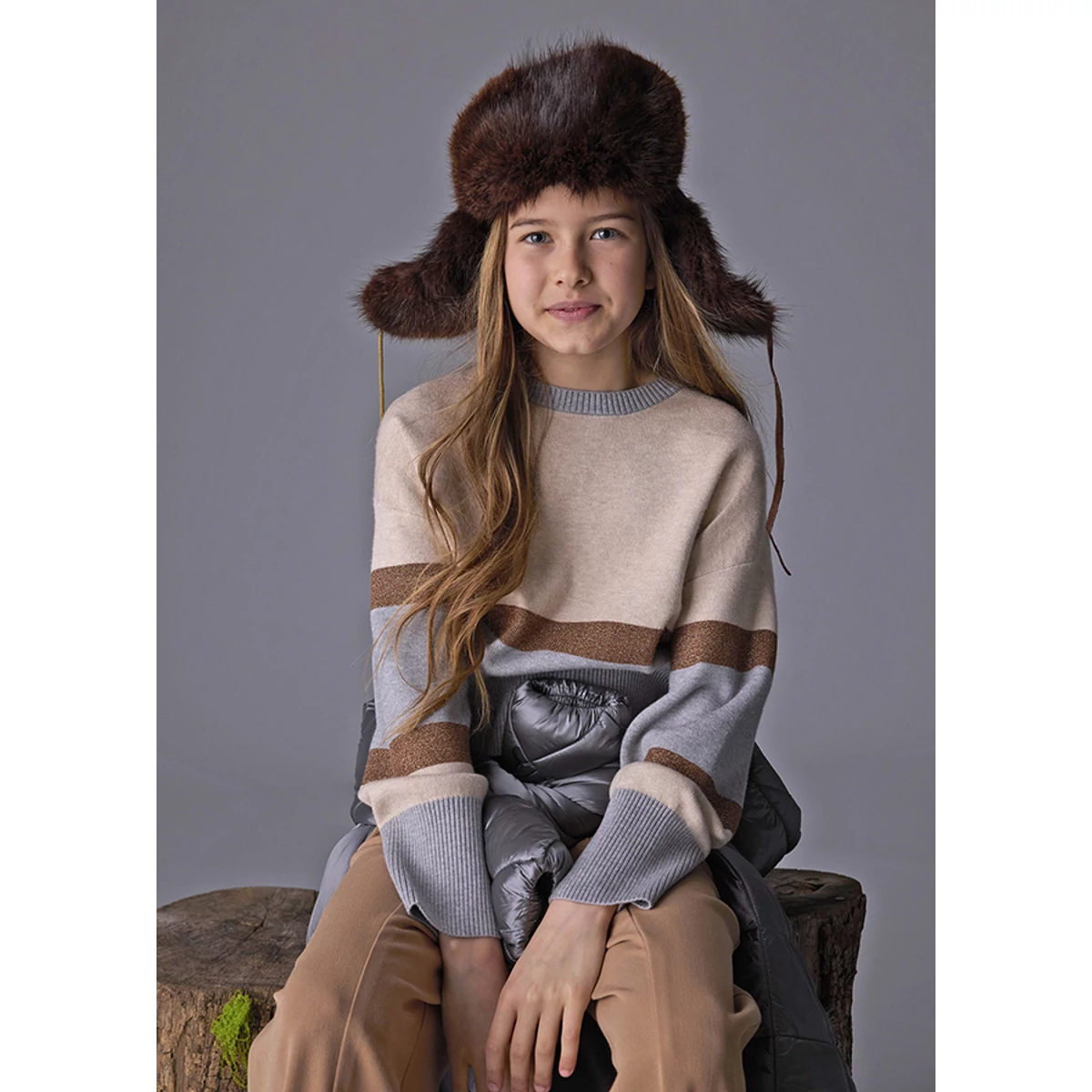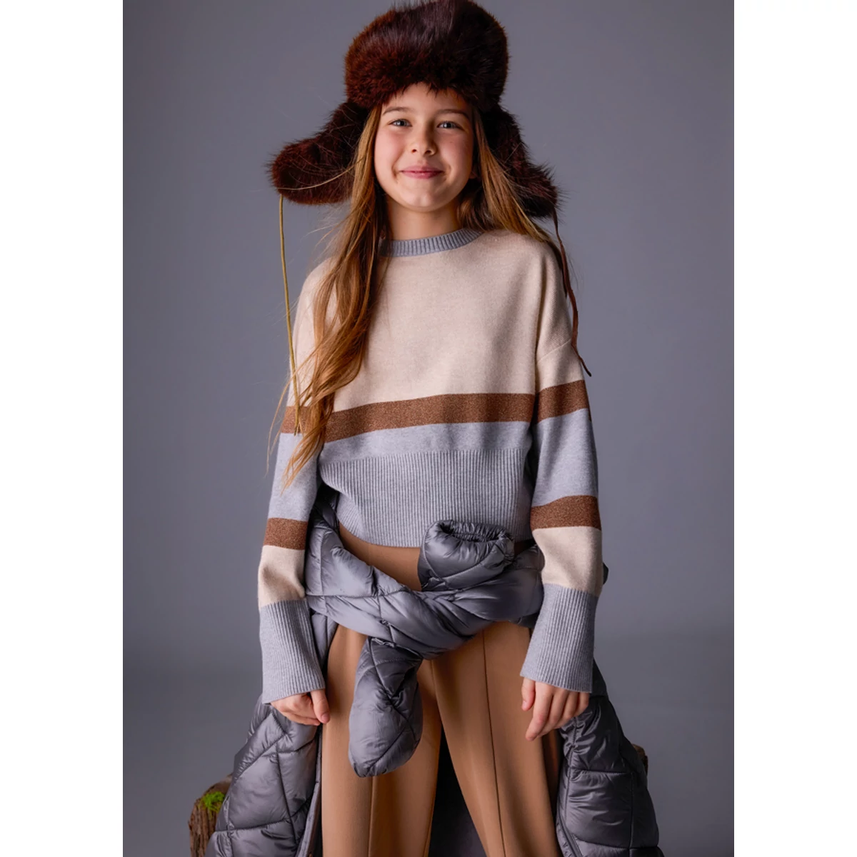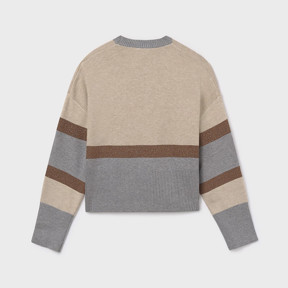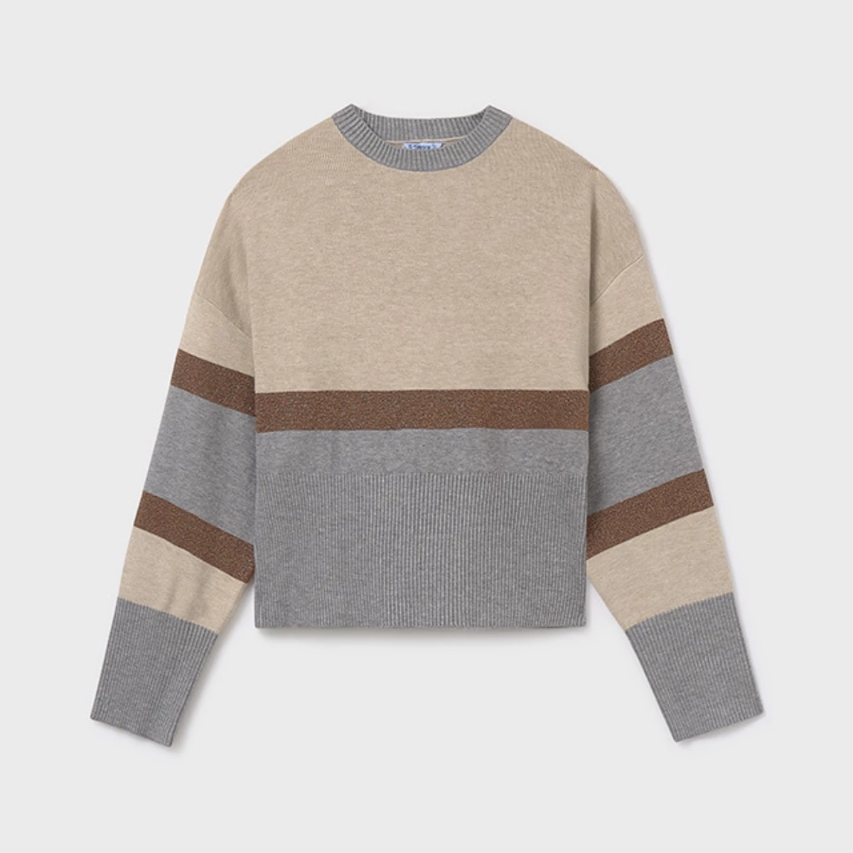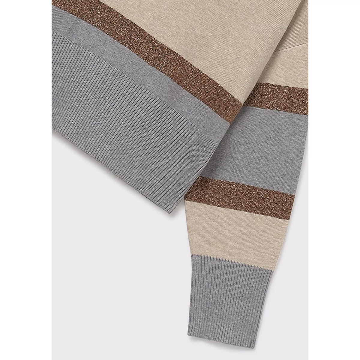 Mayoral csinos tömbcsíkos kötött pulóver széles passzéval a derekán és az ujjain, kerek nyakkal, rugalmas és puha sűrűn kötött anyagból készült. Csinos nagylány viselet.
