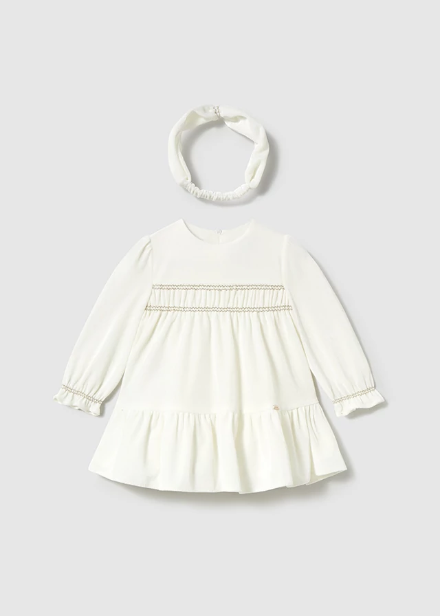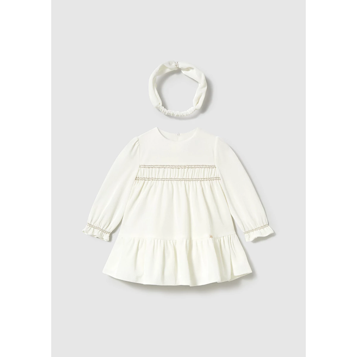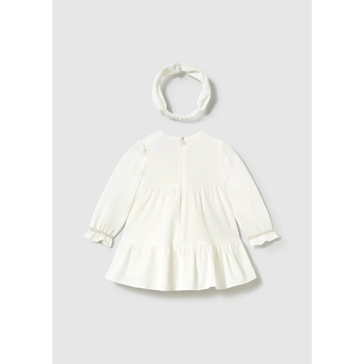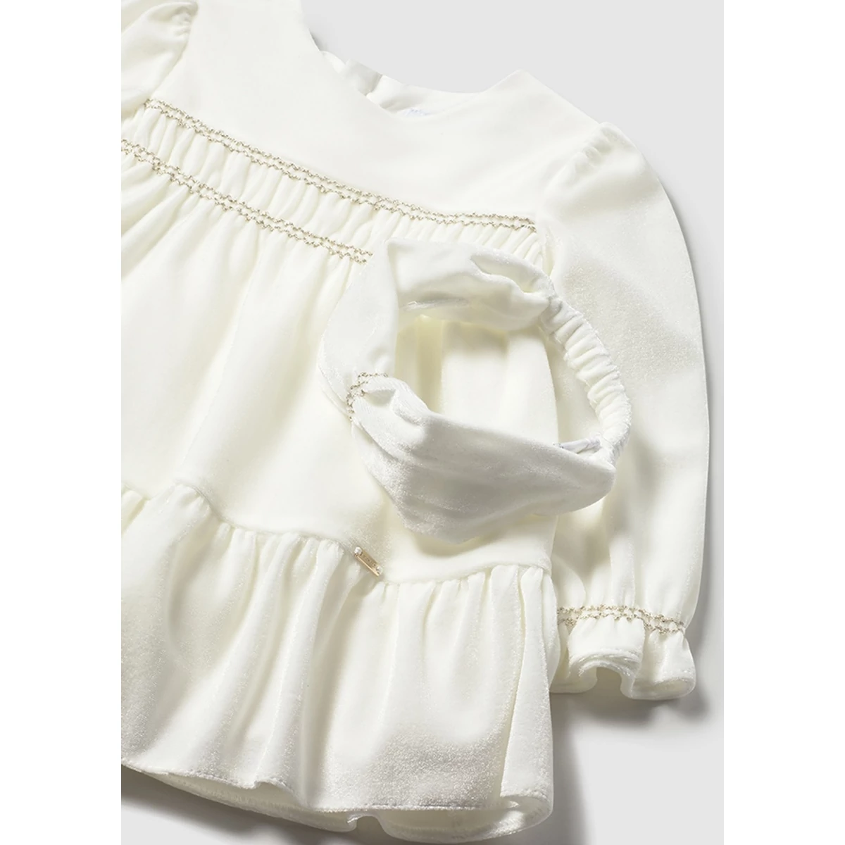Mayoral csodaszép alkalmi plüssruha fejpánttal törtfehér színben, rugalmas és pihe-puha plüssbársony anyagból készült, A-vonalú fazonnal, mellrészénél és ujjain arany hímzéssel díszített, fodros gumírozott ujjakkal, pamut béléssel, alul fodorral, hátán cipzárral záródik. a fejpánt ugyanilyen anyagú széles fazonú, hátul gumírozott, a tetején ráncolt díszítéssel. Igazán szép alkalmi ruha és anyaga miatt nagyon kényelmes is. 2025 TÉL
