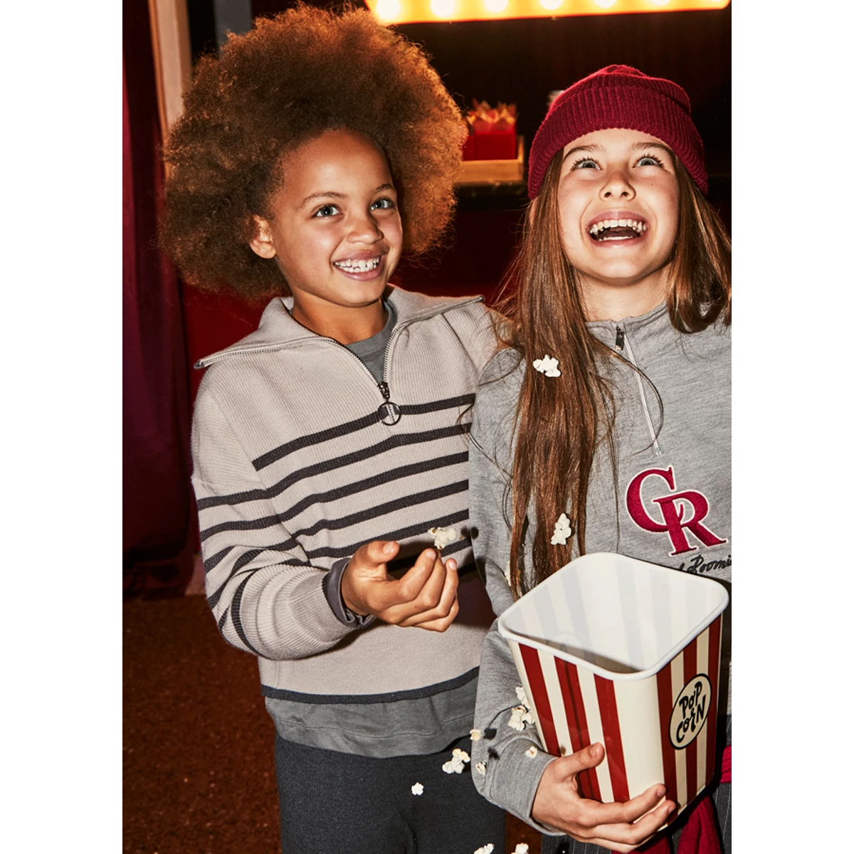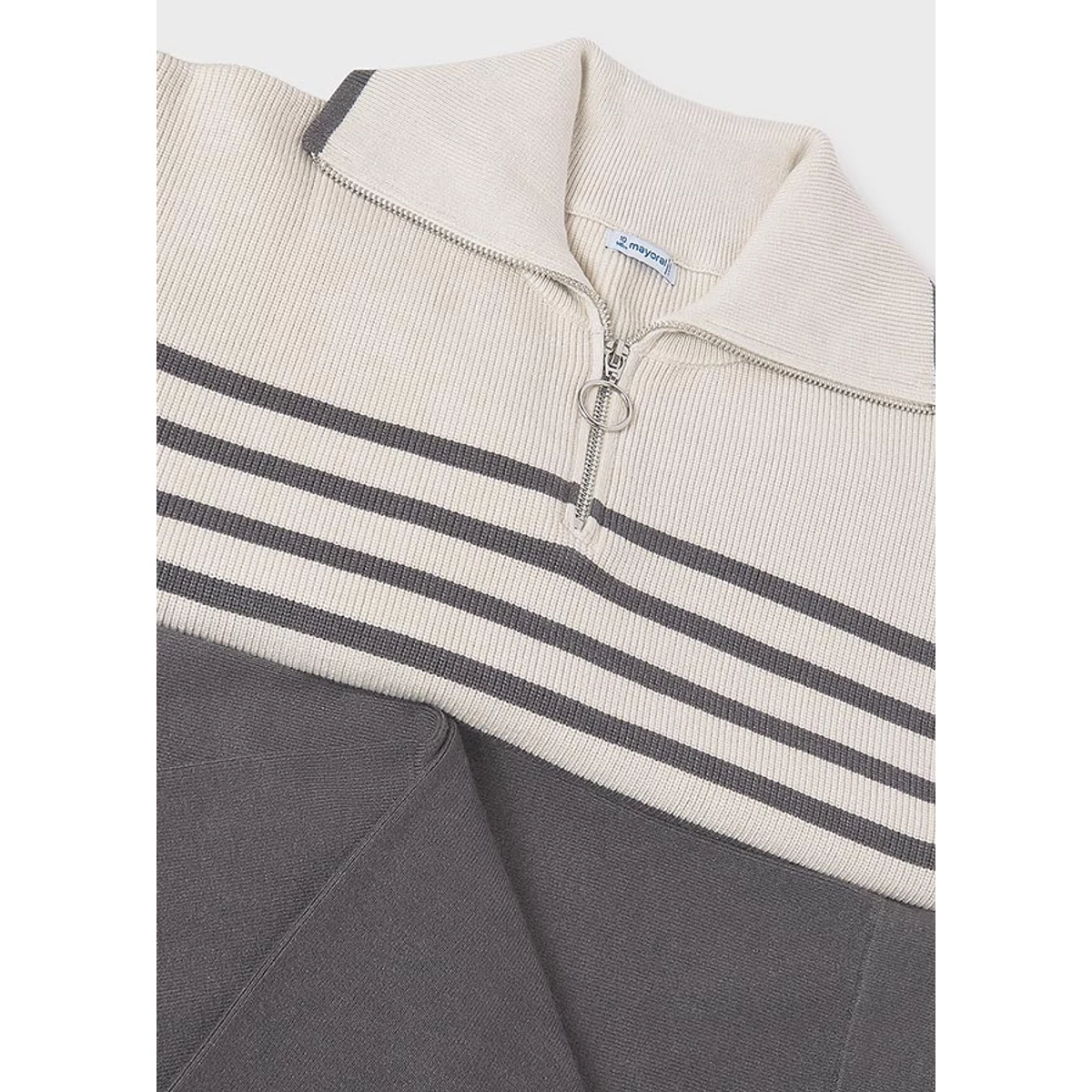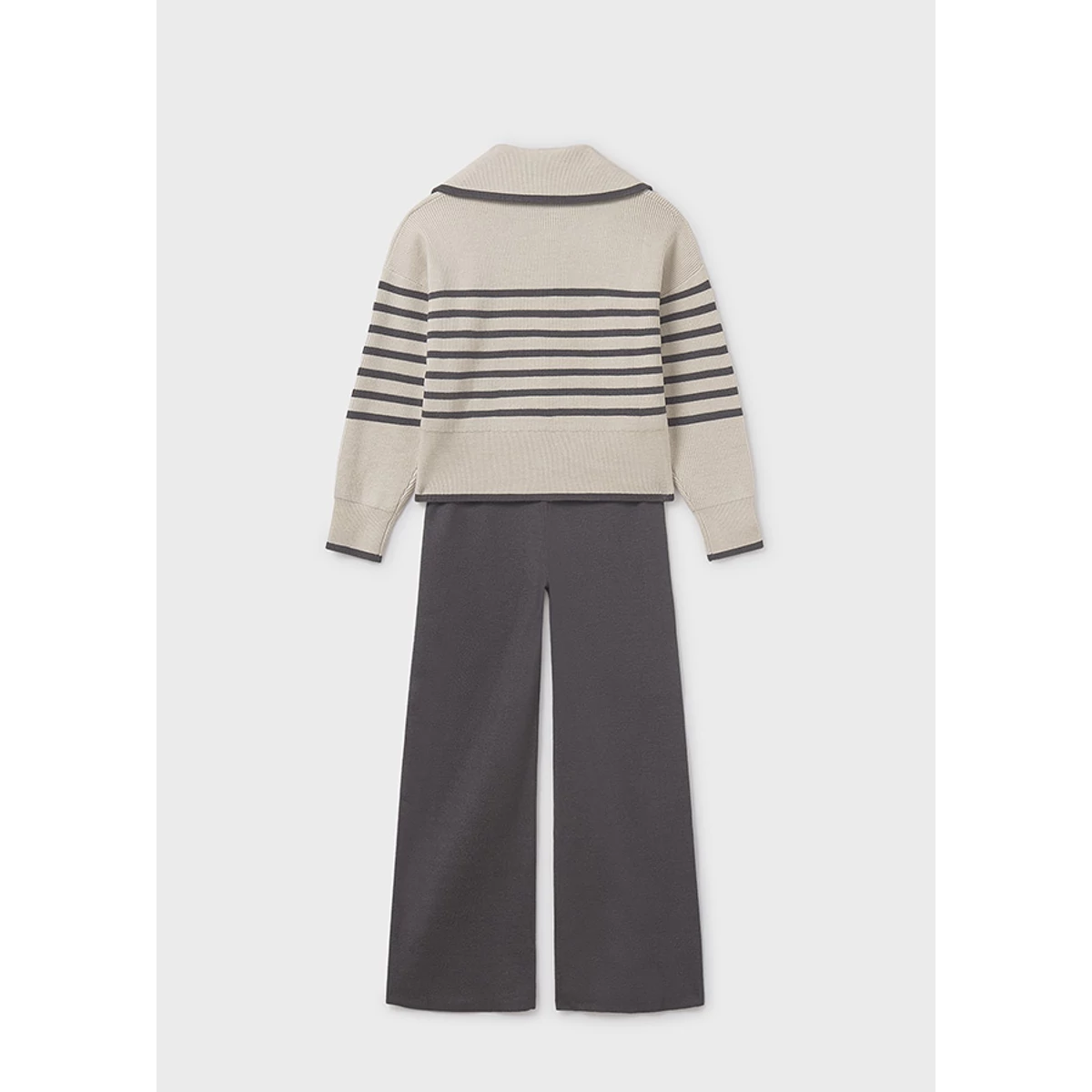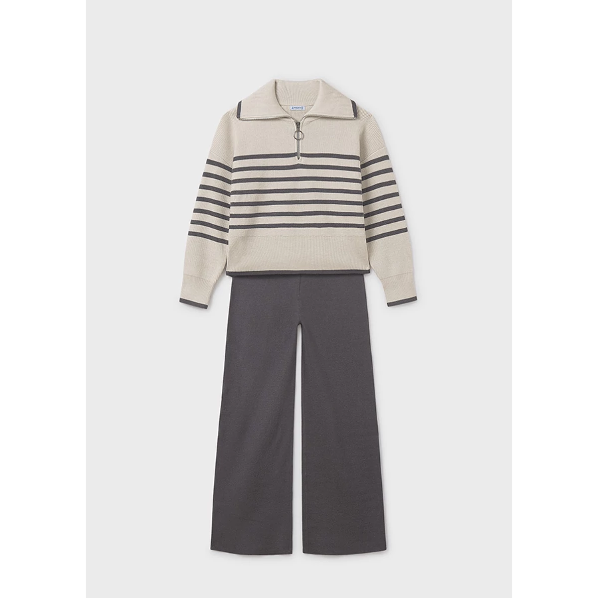 Mayoral csodaszép kétrészes kötött pulóver és nadrág szett, ami egy csíkos-galléros nagyon puha finomkötött pulóverből áll, elöl rövid cipzáras díszítéssel, és egy bőszárú extra rugalmas és puha finomkötött nadrágból áll. Gyönyörű termék. 2025 TÉL