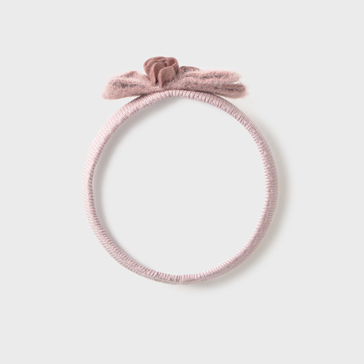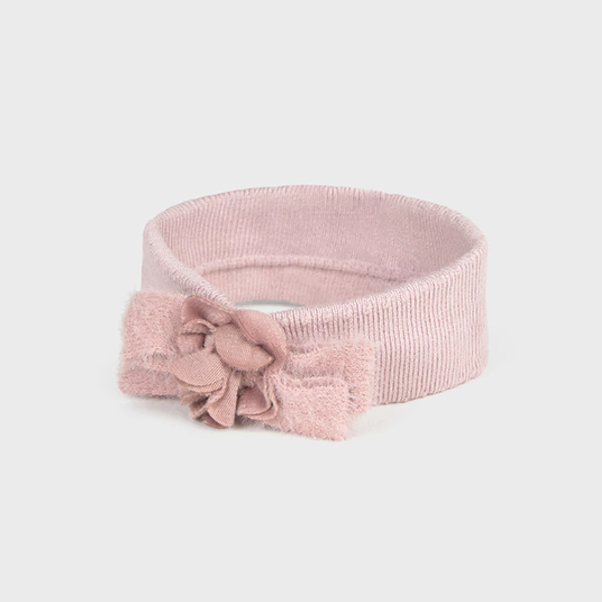 Mayoral csodaszép elasztikus és puha anyagú kötött fejpánt, a fejpántot egy szőrme anyagú masni díszíti közepén virággal, díszdobozban szállítjuk.