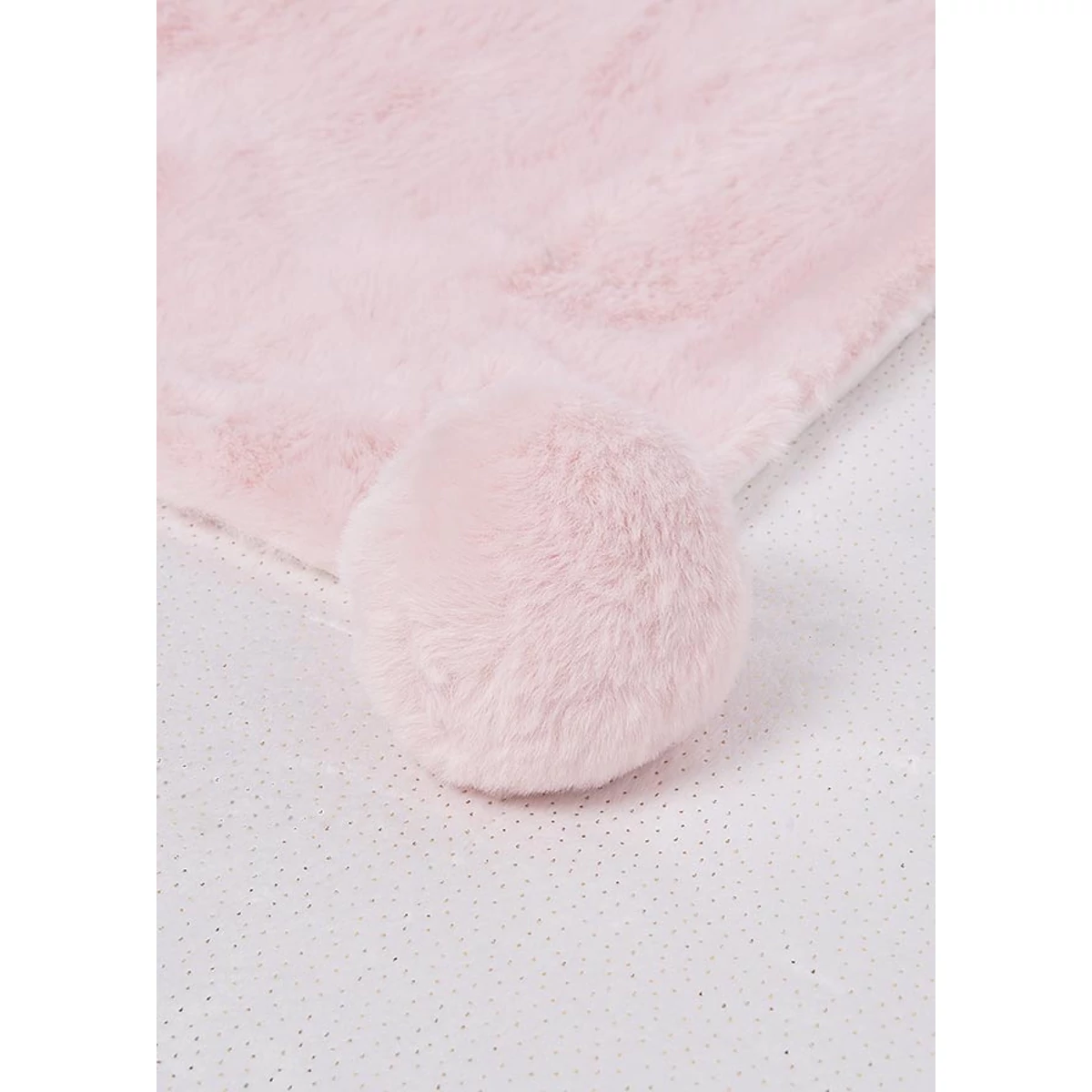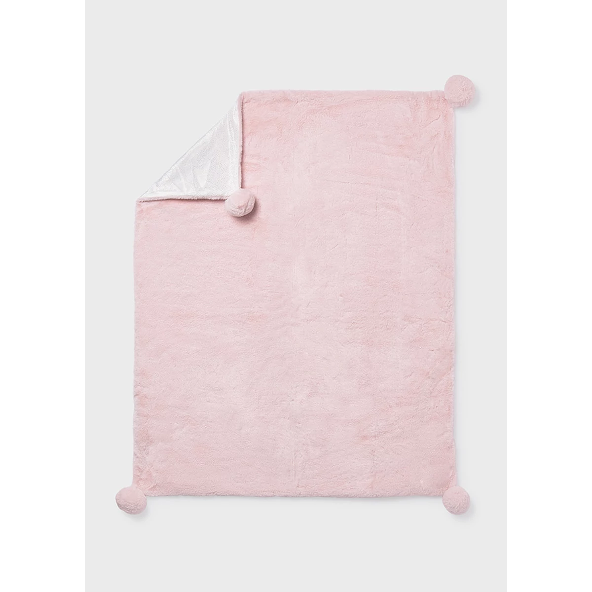 Mayoral extra puha csodaszép plüss takaró a sarkain pom-pom-okkal díszített. Egyik oldala babarózsaszín szőrmés másik oldala fehér aprópöttyös. A takaró méretei: 100cm x 80cm. Csodaszép termék élőben is.
