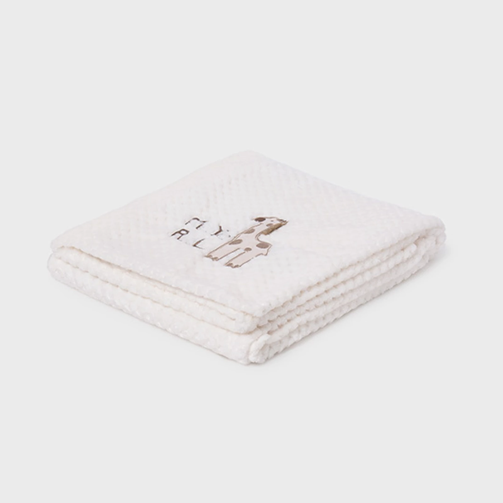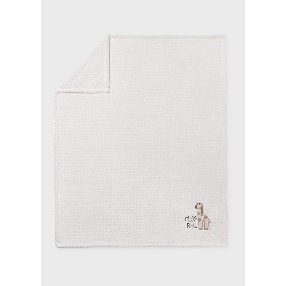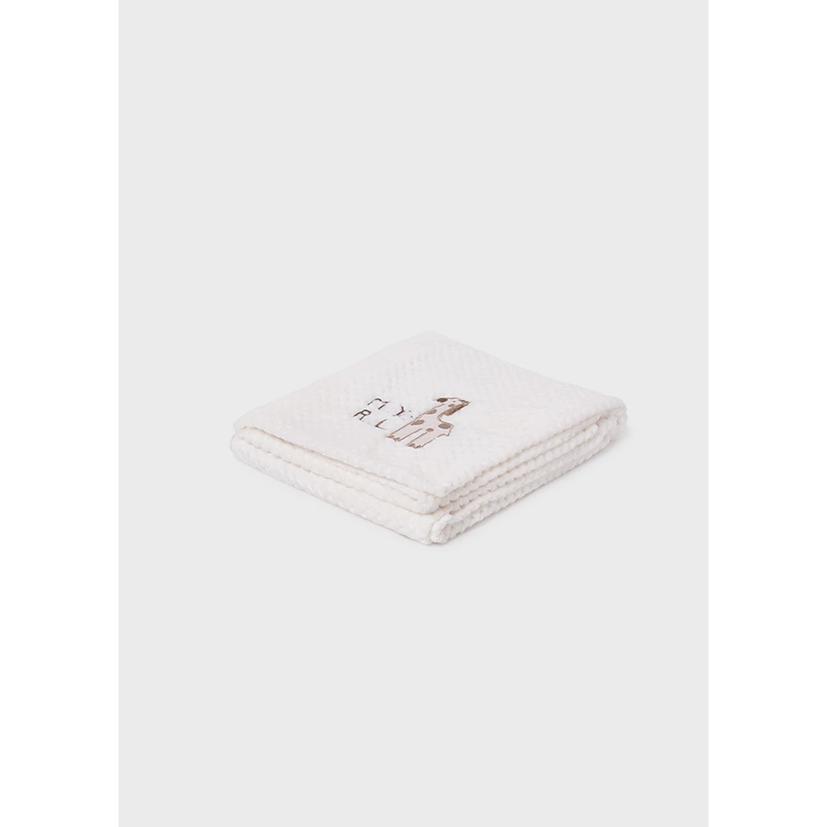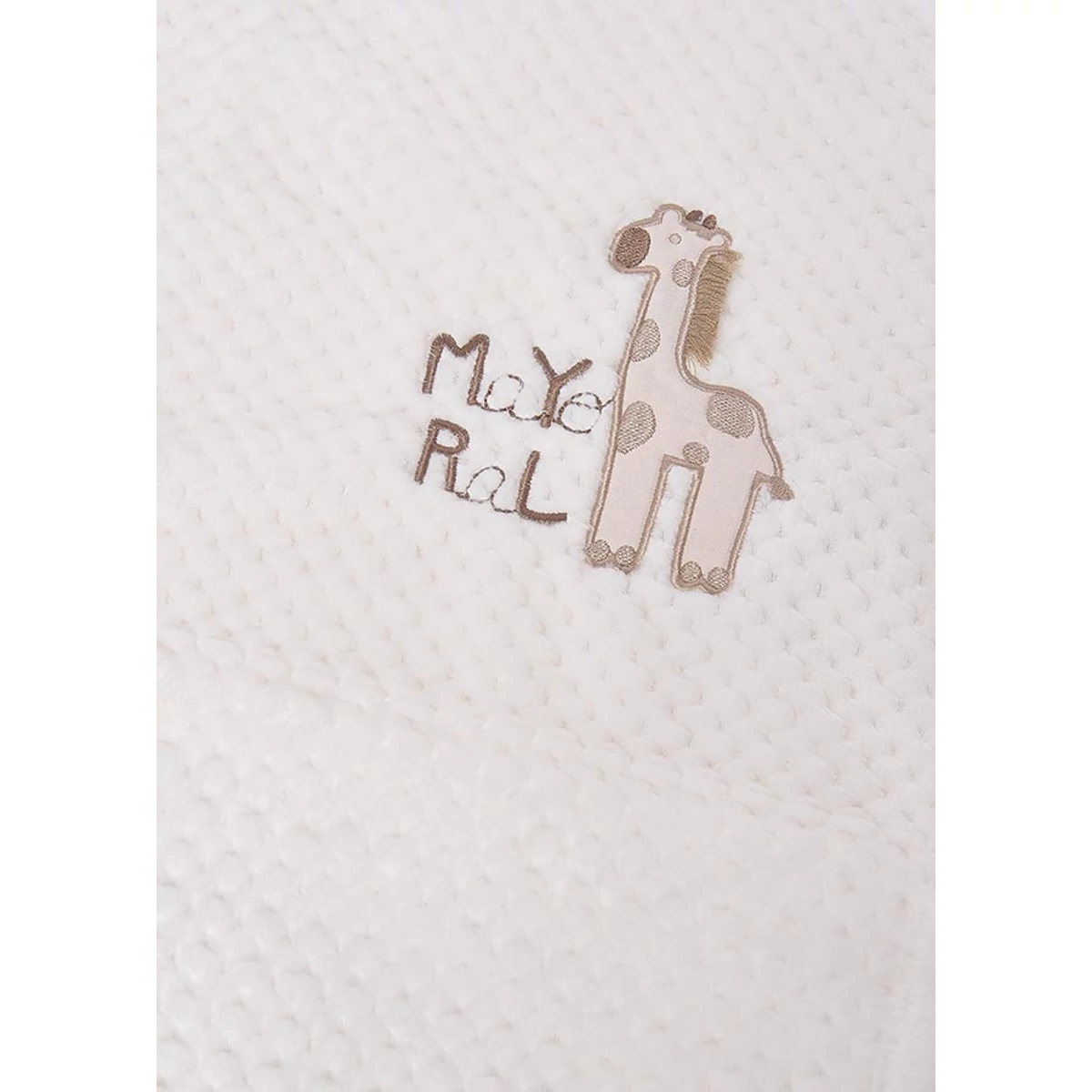 Mayoral pihe puha, rugalmas törtfehér szőrmés takaró cuki zsiráfos rátéttel. A termék méretei: 100cm x 84cm.