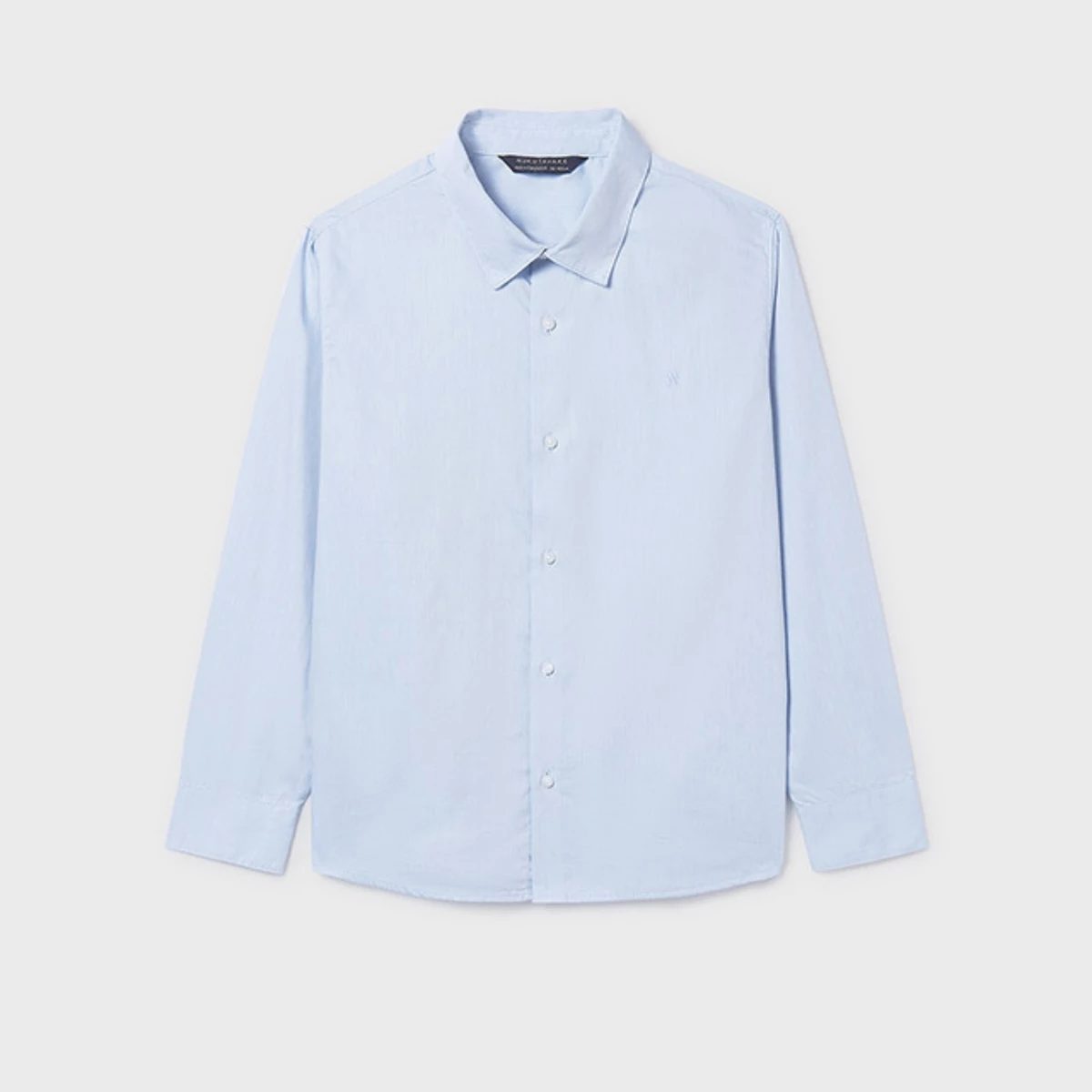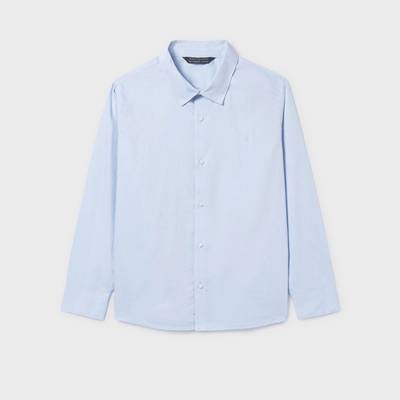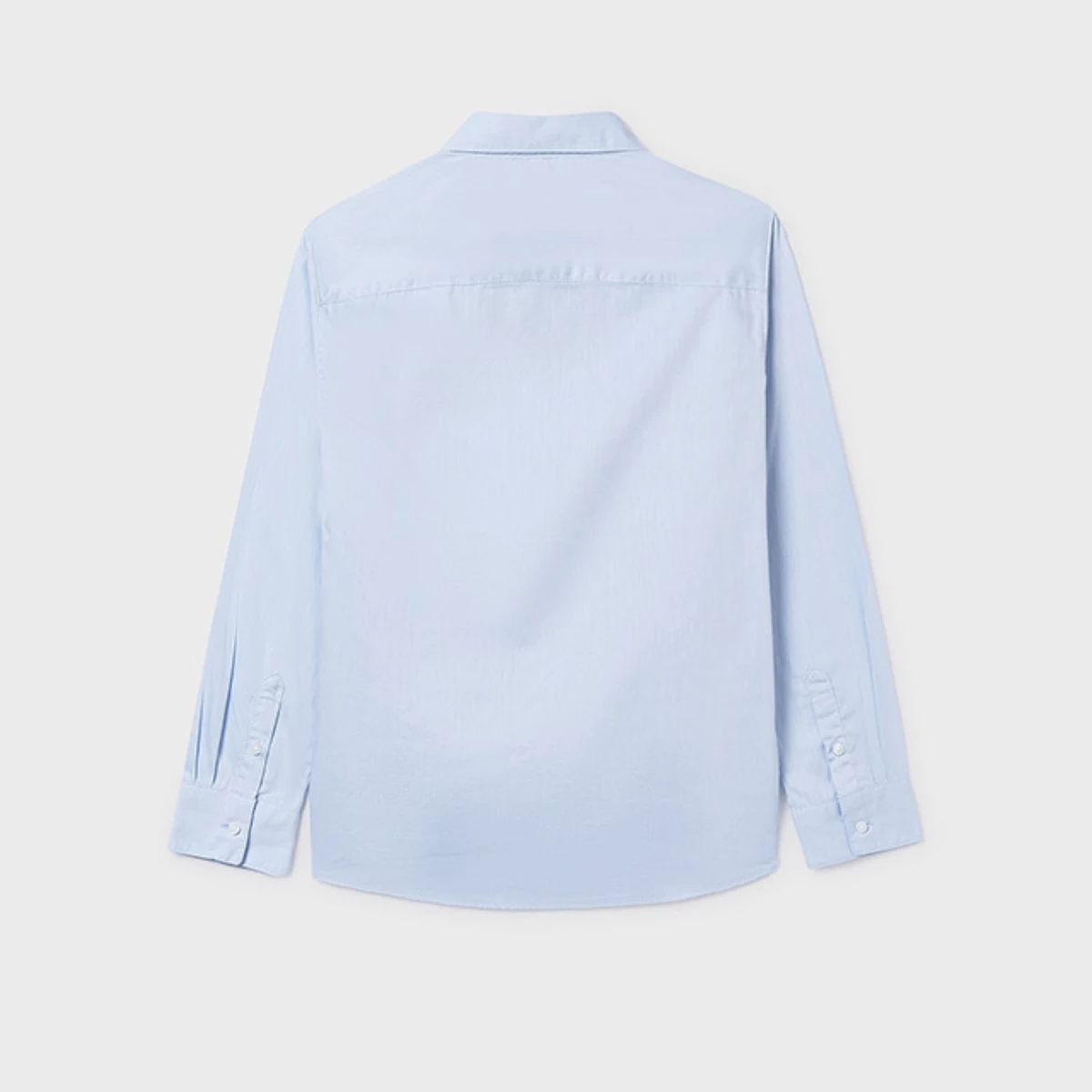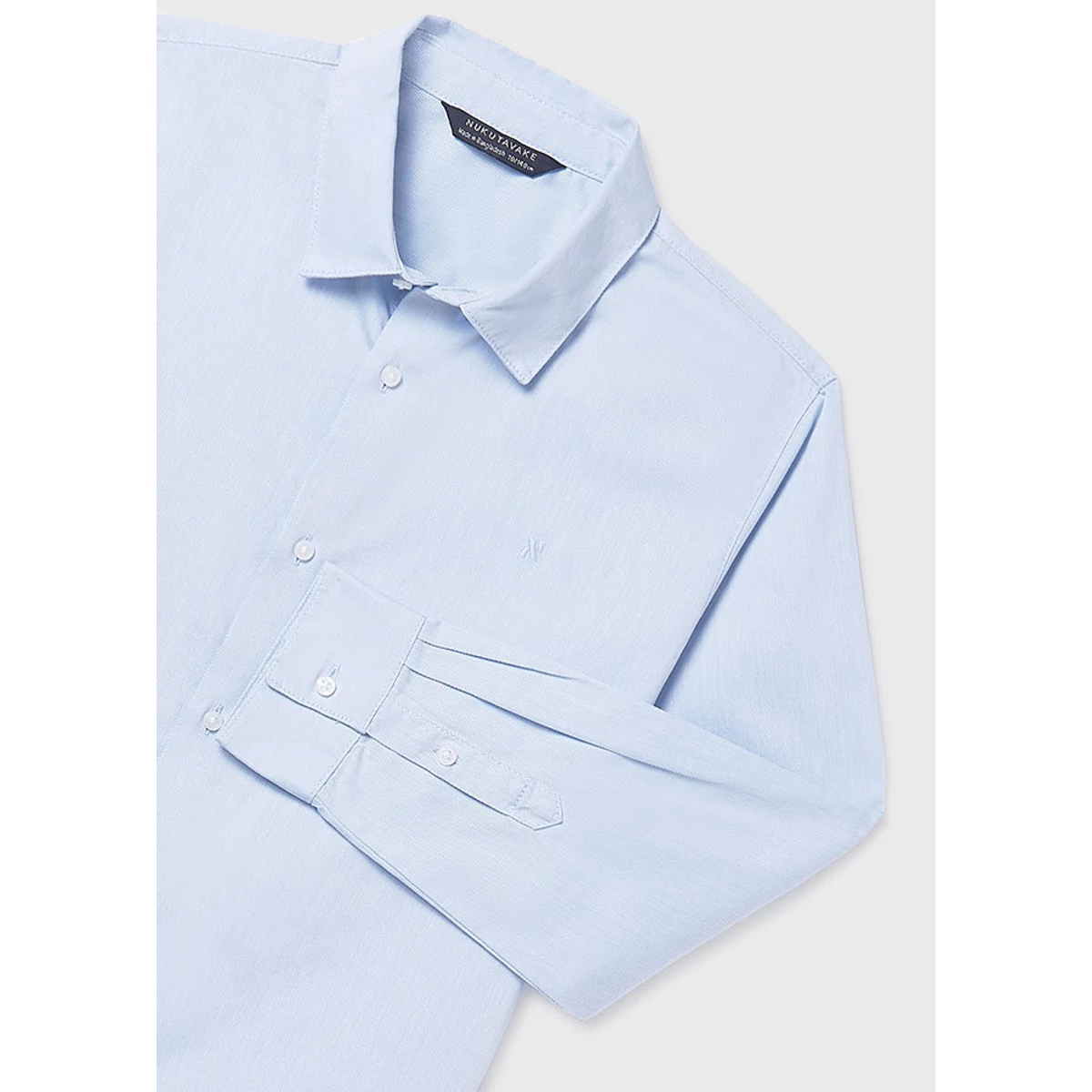 Mayoral elegáns hosszú ujjú világoskék ing, gallérral, apró mellzsebbel, 100% pamut anyagból készült elegáns viselet.