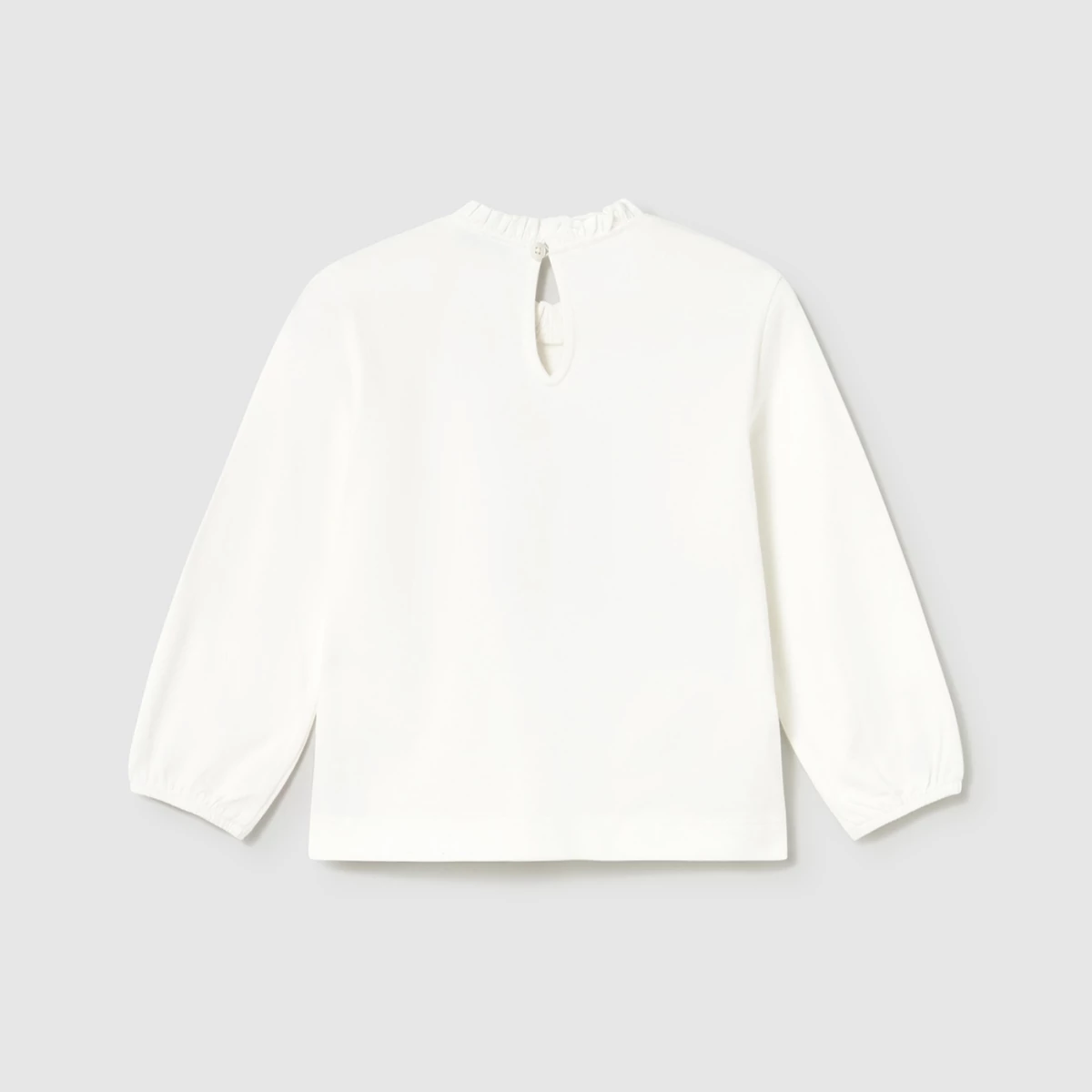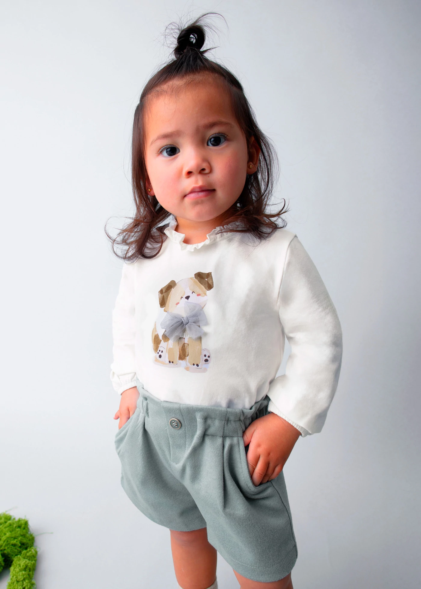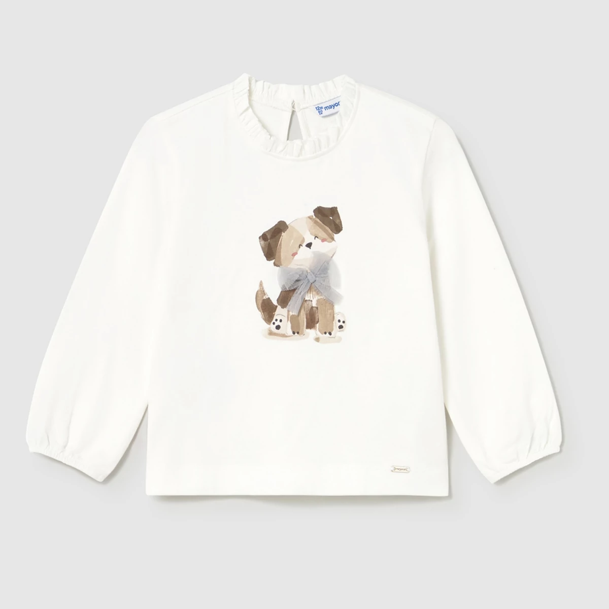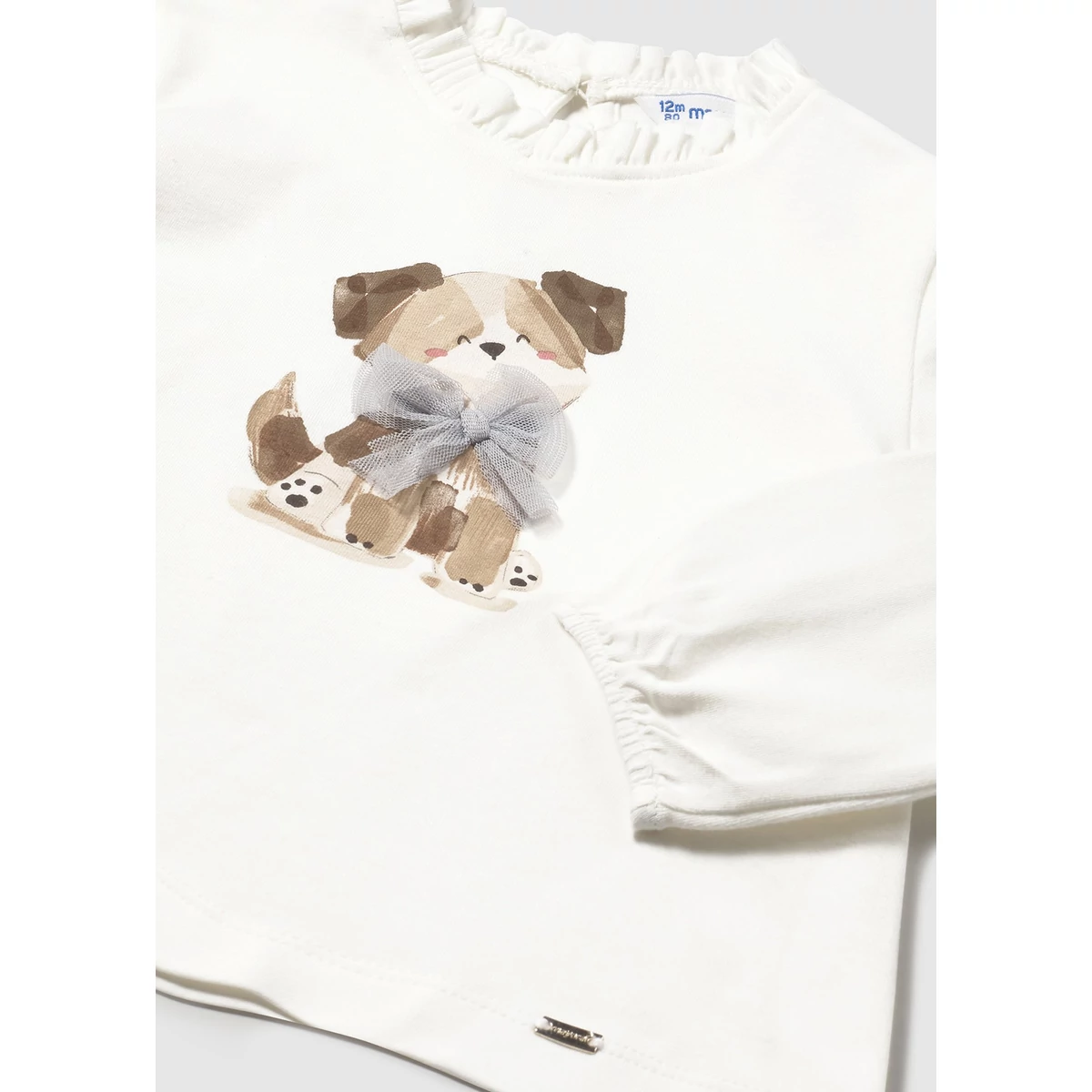 Mayoral elegáns kiskutyás felső tüll masnival díszítve, csinos fodros nyakrésszel és gumírozott ujjal, extra rugalmas pamut anyagból készült, hátán 1 gombbal záródik.  2025 TÉL