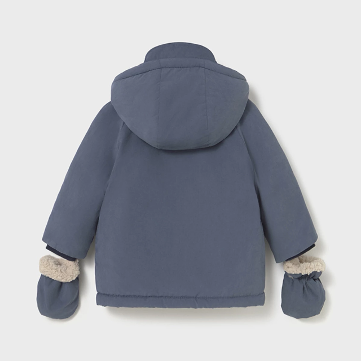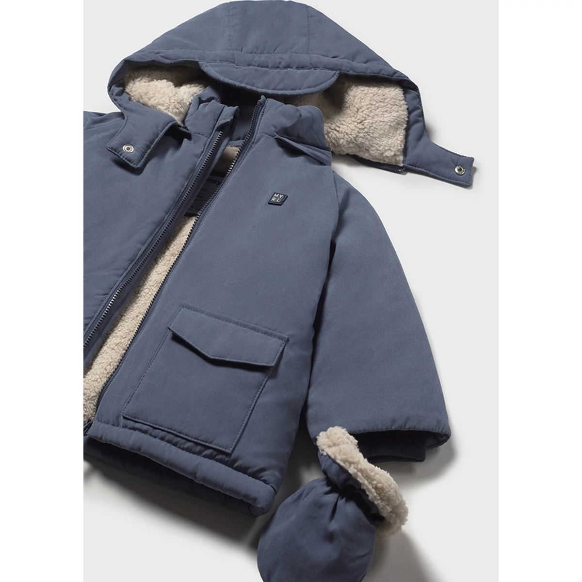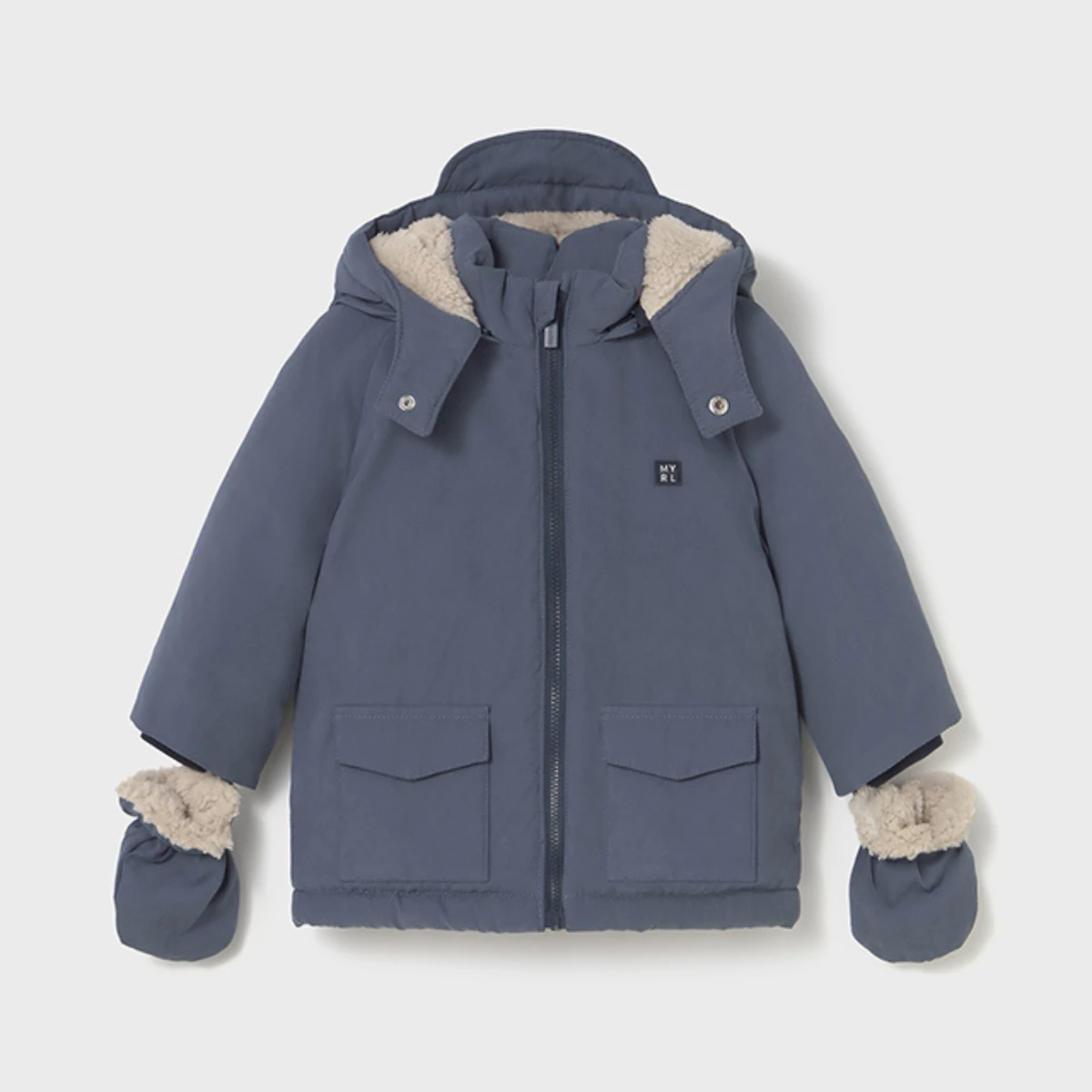 Mayoral extra meleg parka fazonú szőrmés télikabát levehető kapucnival, cipzárral záródik, puha és meleg szőrme béléssel, a kapucnija is szőrmével bélelt, a kapucnija lecipzározható, 1 ujjas szőrmével bélelt kesztyűvel. Az idei kollekció legmelegebb kabátja.