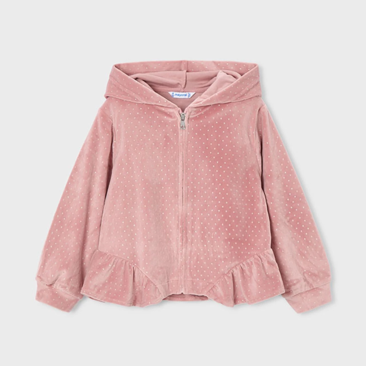 Mayoral 3 részes gyönyörű csillogó melegítő szett plüssbársonyból, ami egy 3D tüll masnival díszített balerinás felsőből áll, puha pamutból készült, egy kapucnis cipzáras finoman csillogó strasszokkal kirakott pulóverből áll, hihetetlenül finom rugalmas anyagú, alul az oldalán fodor teszi még csinosabbá, továbbá egy jogger fazonú extra puha és rugalmas plüssbársony melegítőalsóból áll, gumírozott derékrésszel és az alján passzéval. Kényelmes ,csinos és nagyon egyedi viselet őszre-télre.