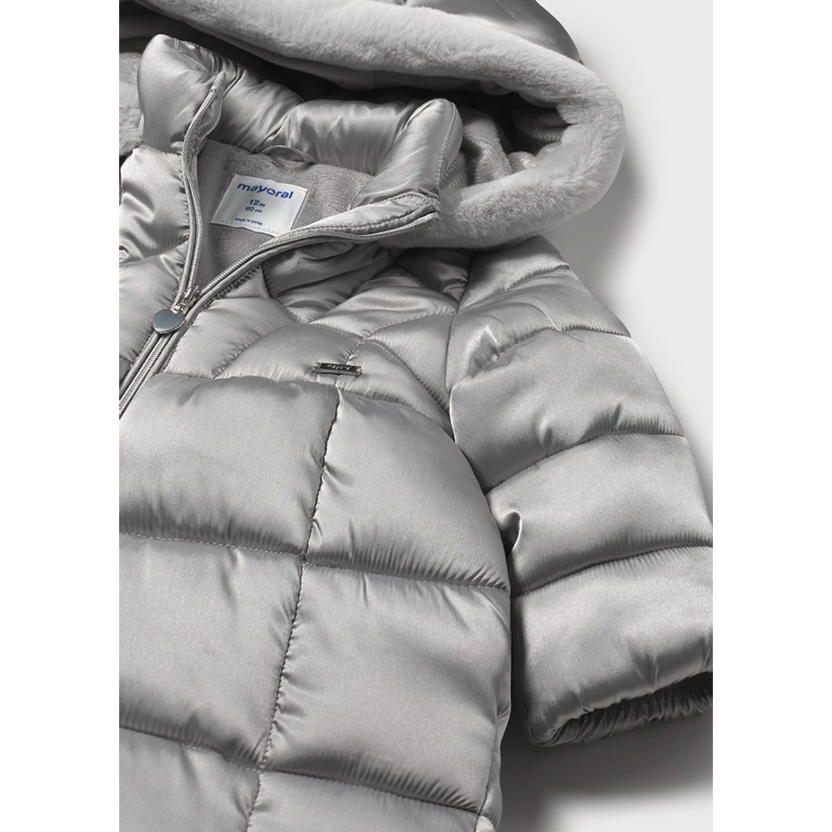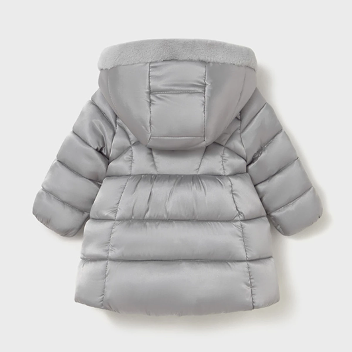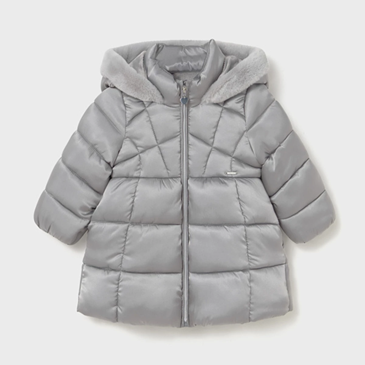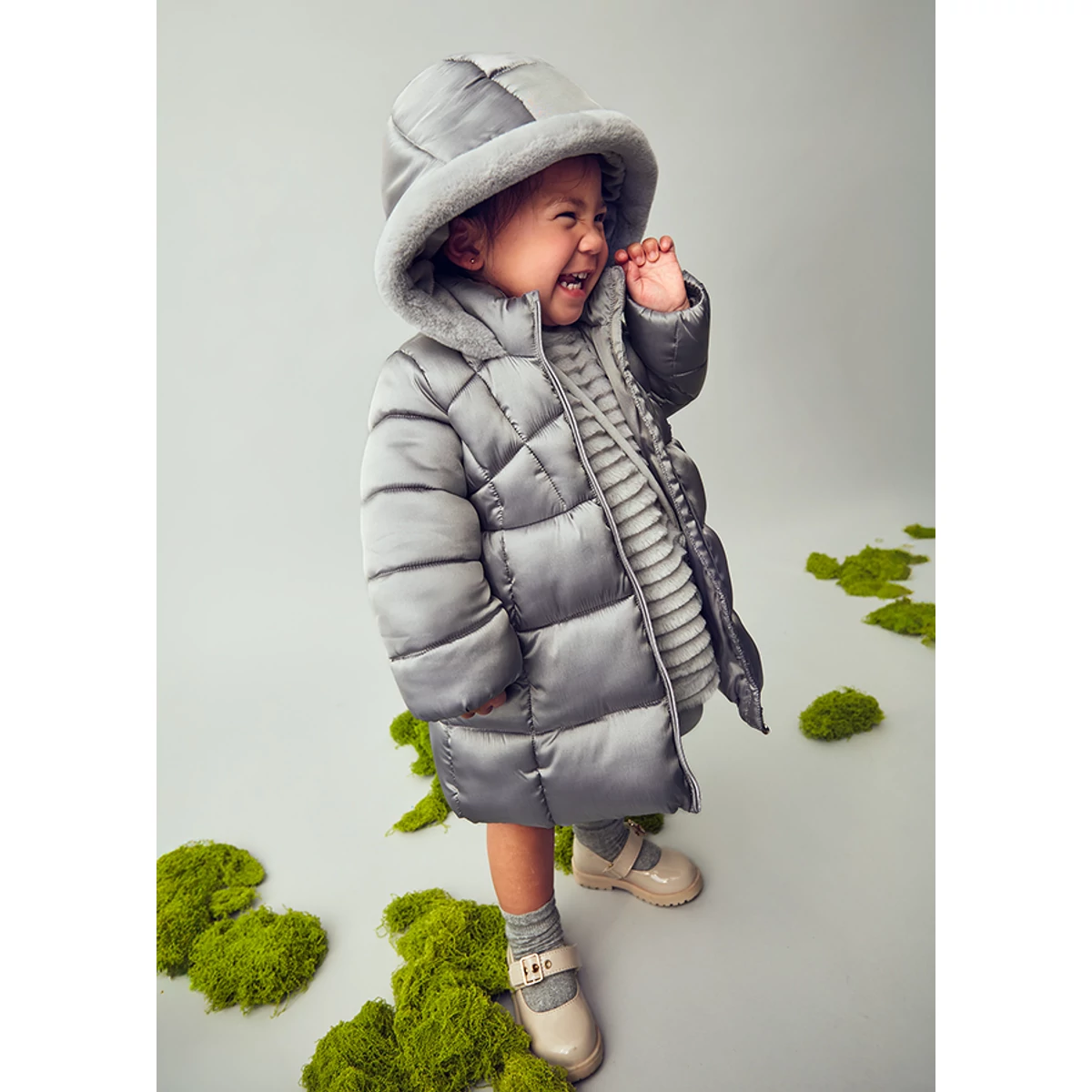 Mayoral gyönyörű hosszú fazonú karcsúsított steppelt télikabát szőrmedíszítéses kapucnival, derékban karcsúsított csinos fazonú, cipzárral záródik, gumírozott ujjakkal, belül puha szürke szőrme béléssel, vastag töltettel. Csodaszép télikabát a legkisebbeknek. 2025 TÉL