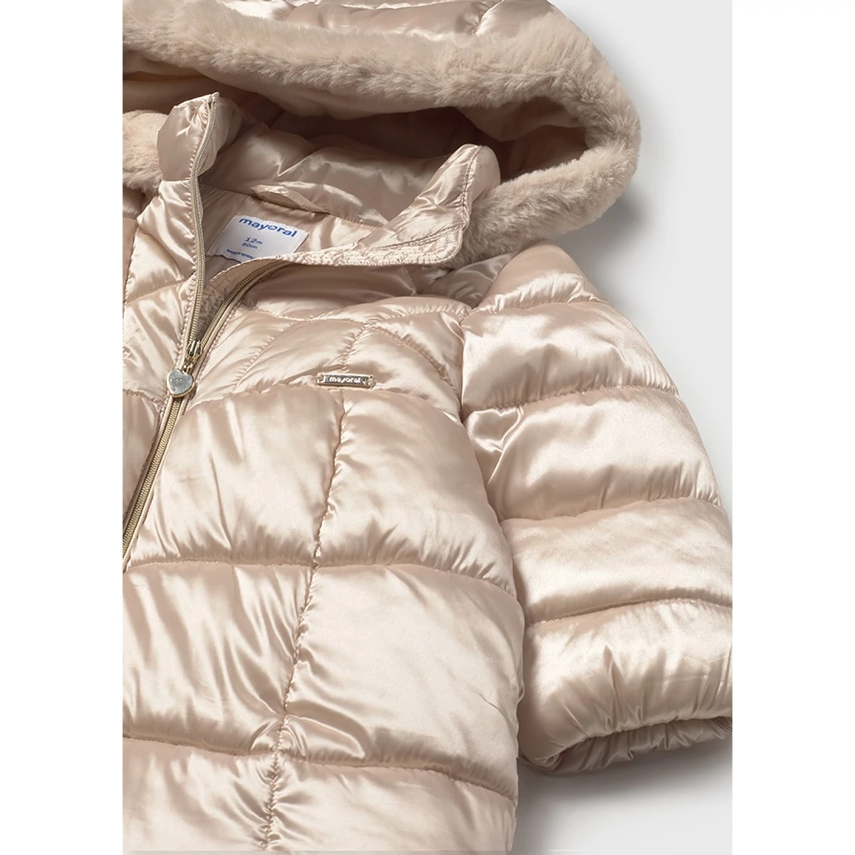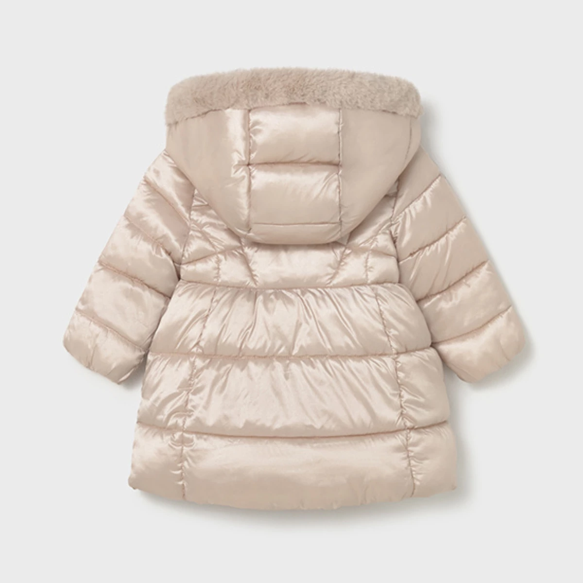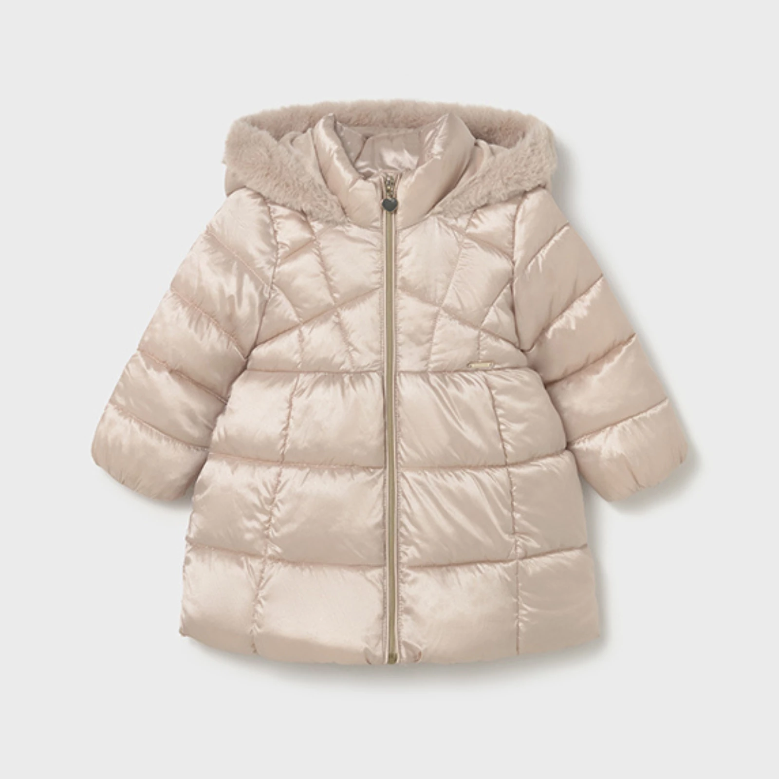 Mayoral gyönyörű hosszú fazonú karcsúsított steppelt télikabát szőrmedíszítéses kapucnival, derékban karcsúsított csinos fazonú, cipzárral záródik, gumírozott ujjakkal, belül puha bézsszínű szőrme béléssel, vastag töltettel. Csodaszép télikabát a legkisebbeknek. 2025 TÉL