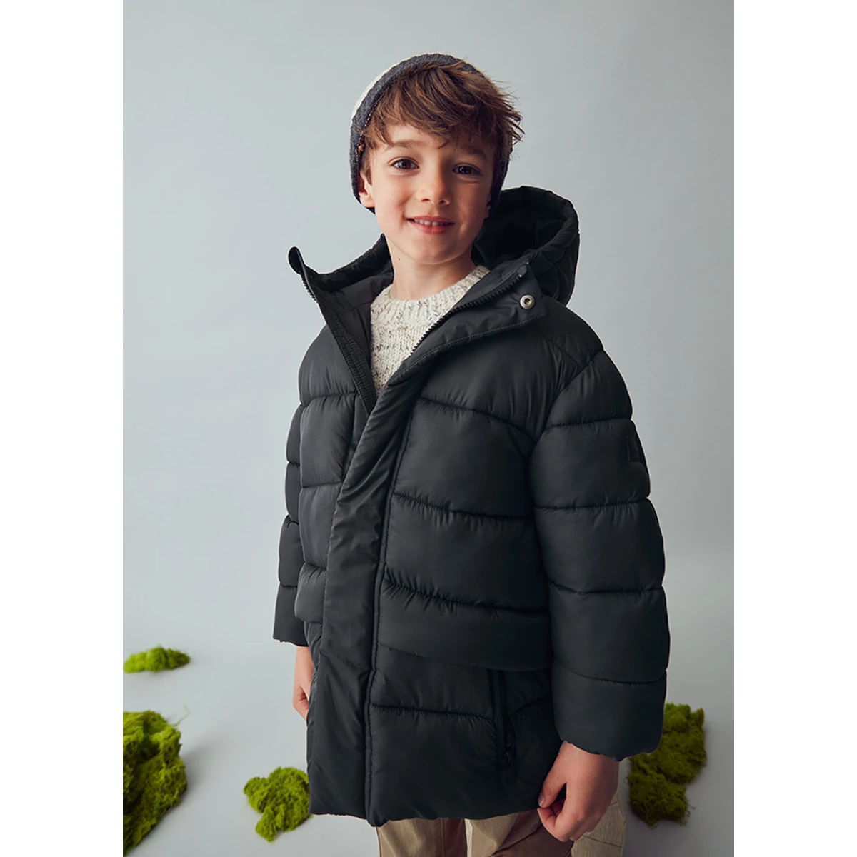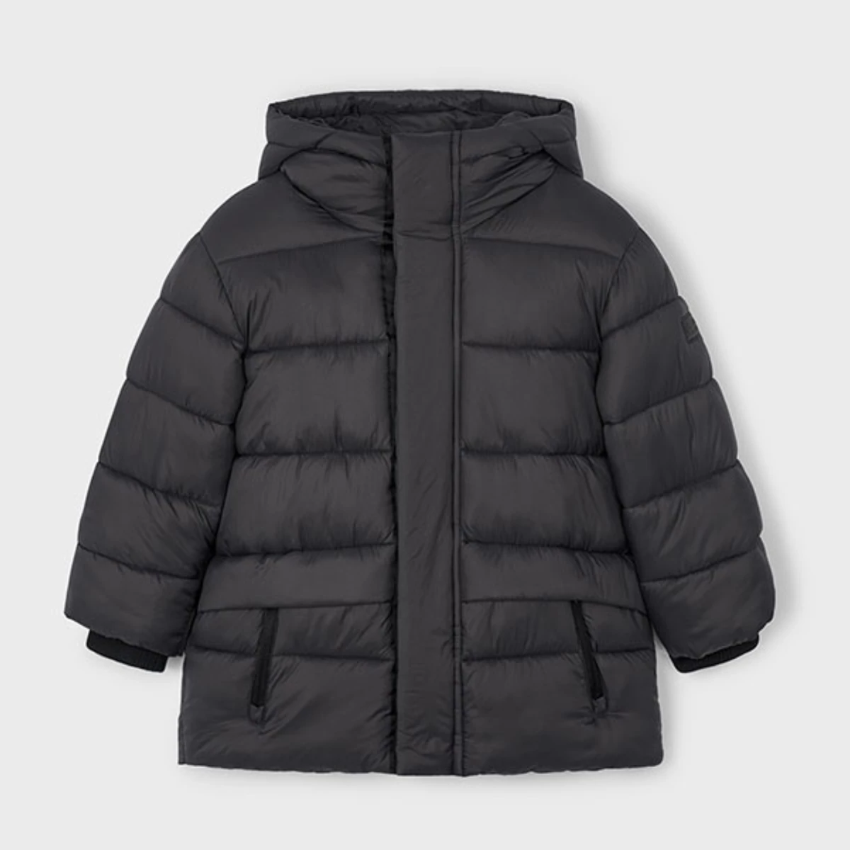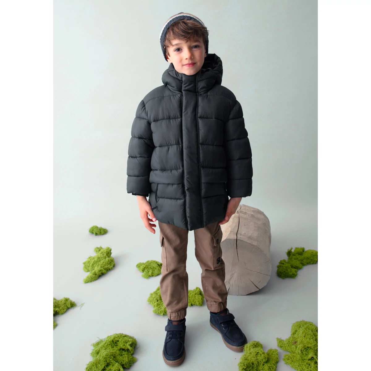 Mayoral hosszú fazonú steppelt kapucnis télikabát kapucnival , cipzárral és rejtett patentokkal záródik, oldalt cipzáras zsebekkel, pamutpasszés ujjakkal, belül plüss béléssel, vastag töltettel, egyenes fazonnal, vállán apró logóval díszített. Kényelmes viselet télre. 2025 TÉL
