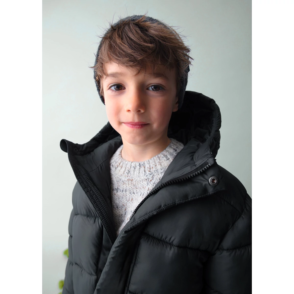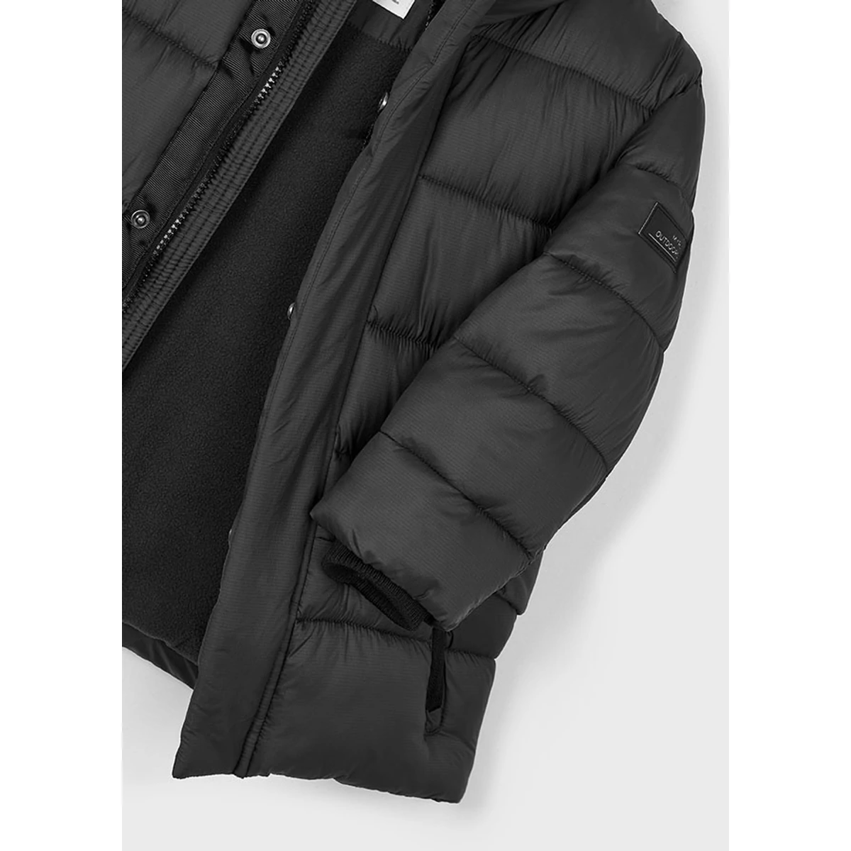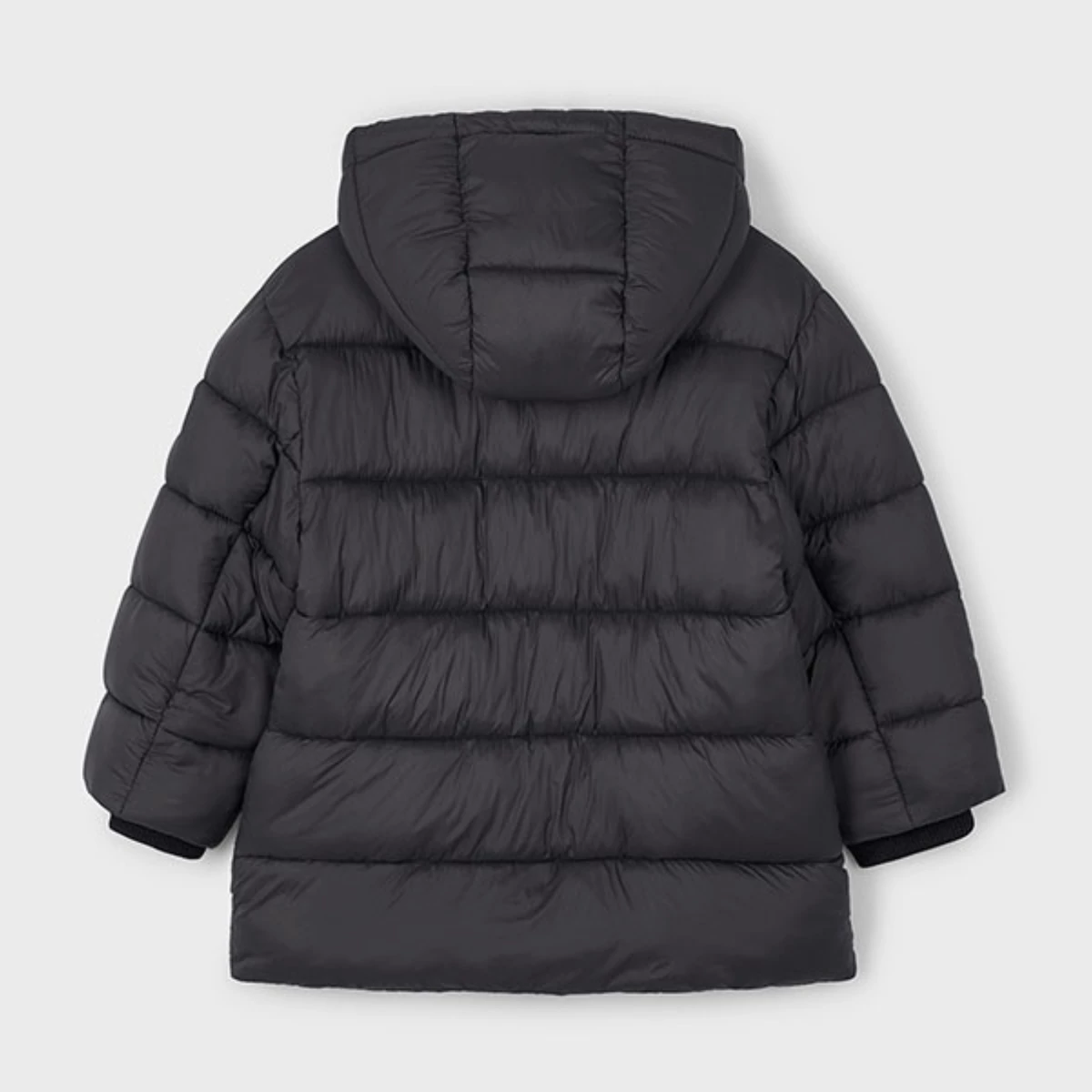 Mayoral hosszú fazonú steppelt kapucnis télikabát kapucnival , cipzárral és rejtett patentokkal záródik, oldalt cipzáras zsebekkel, pamutpasszés ujjakkal, belül plüss béléssel, vastag töltettel, egyenes fazonnal, vállán apró logóval díszített. Kényelmes viselet télre. 2025 TÉL