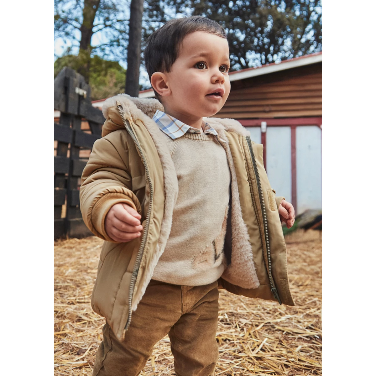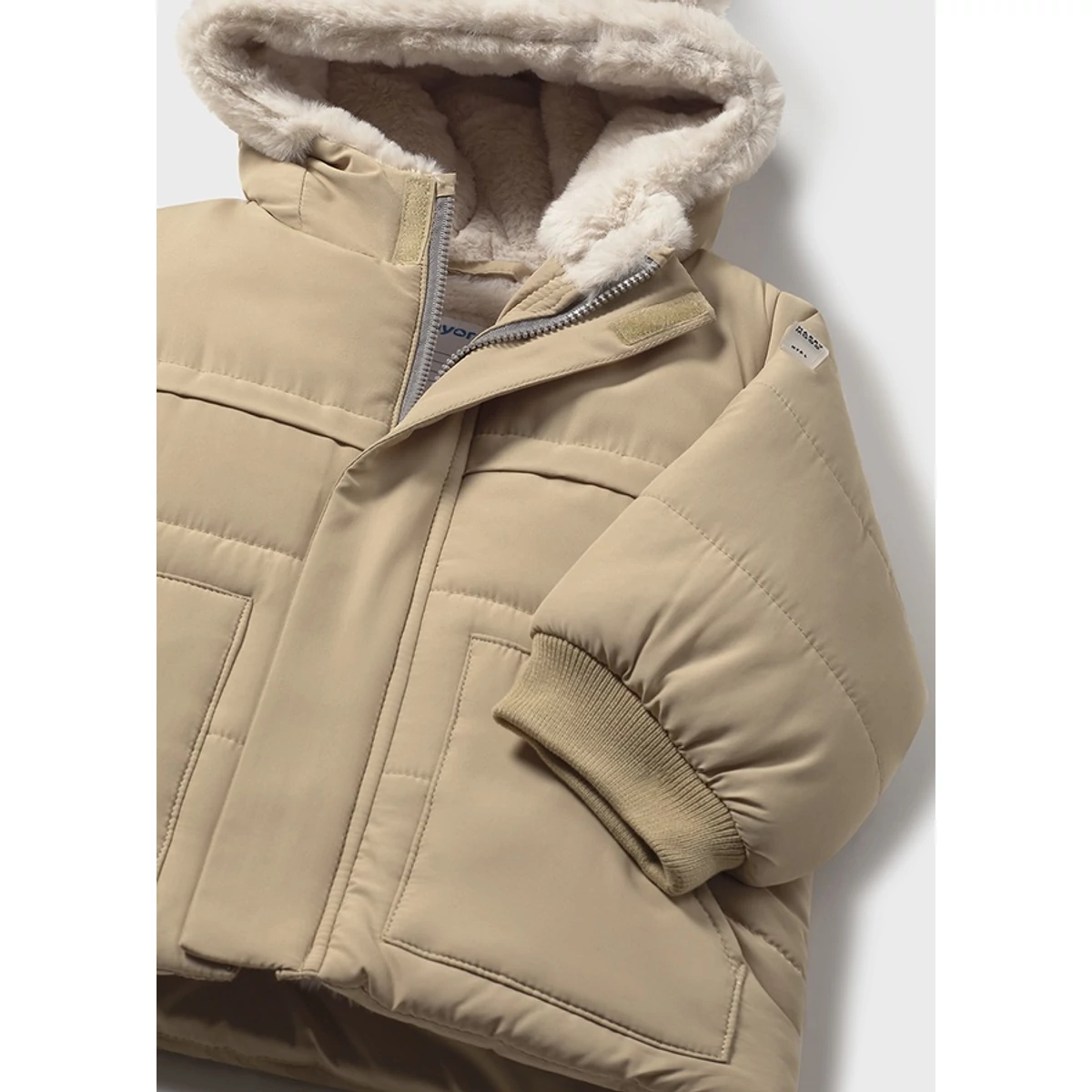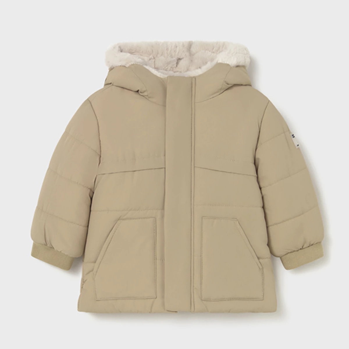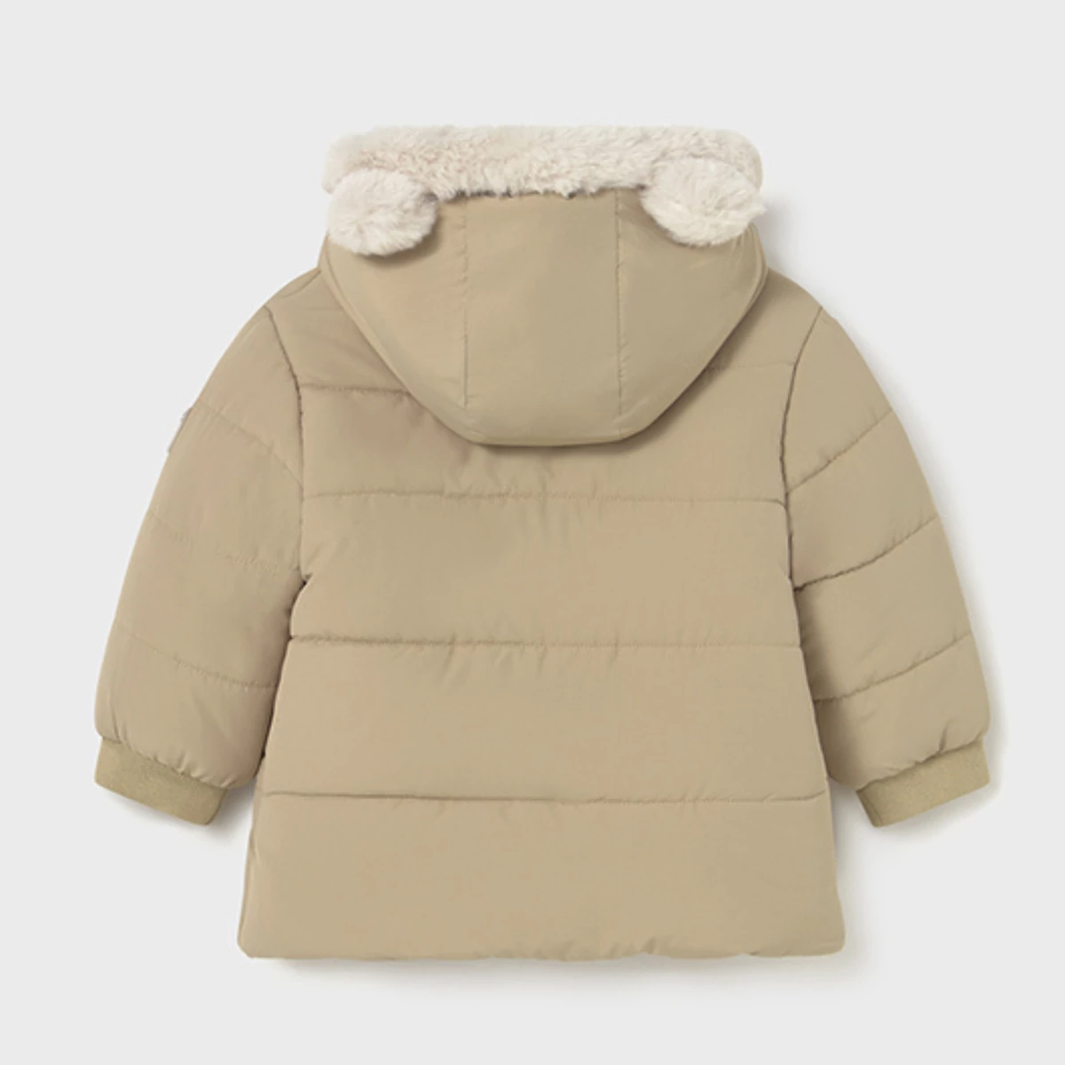 Mayoral hosszú fazonú szőrmés kapucni télikabát belül bézsszínű szőrme béléssel, apró macifüles szőrmés kapucnival, rejtett cipzárral és patentokkal záródik, elöl zsebekkel, vastag töltetű igazi meleg télikabát. 2025 TÉL