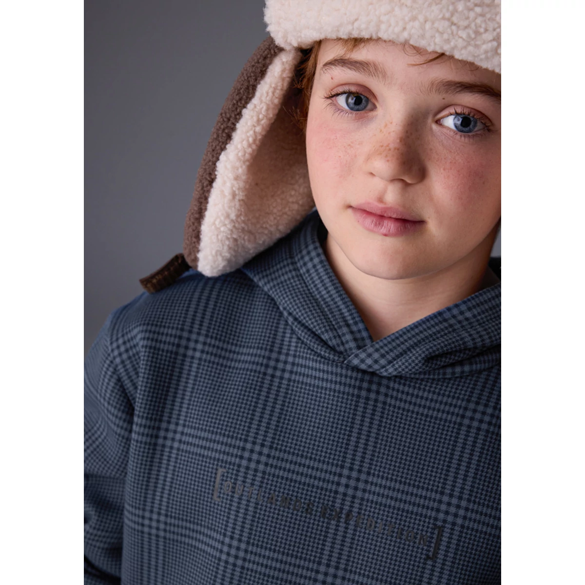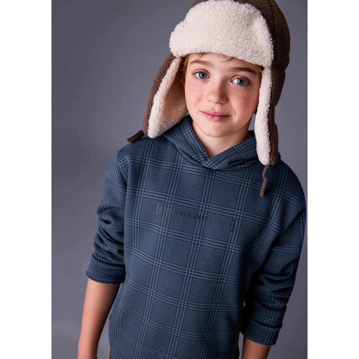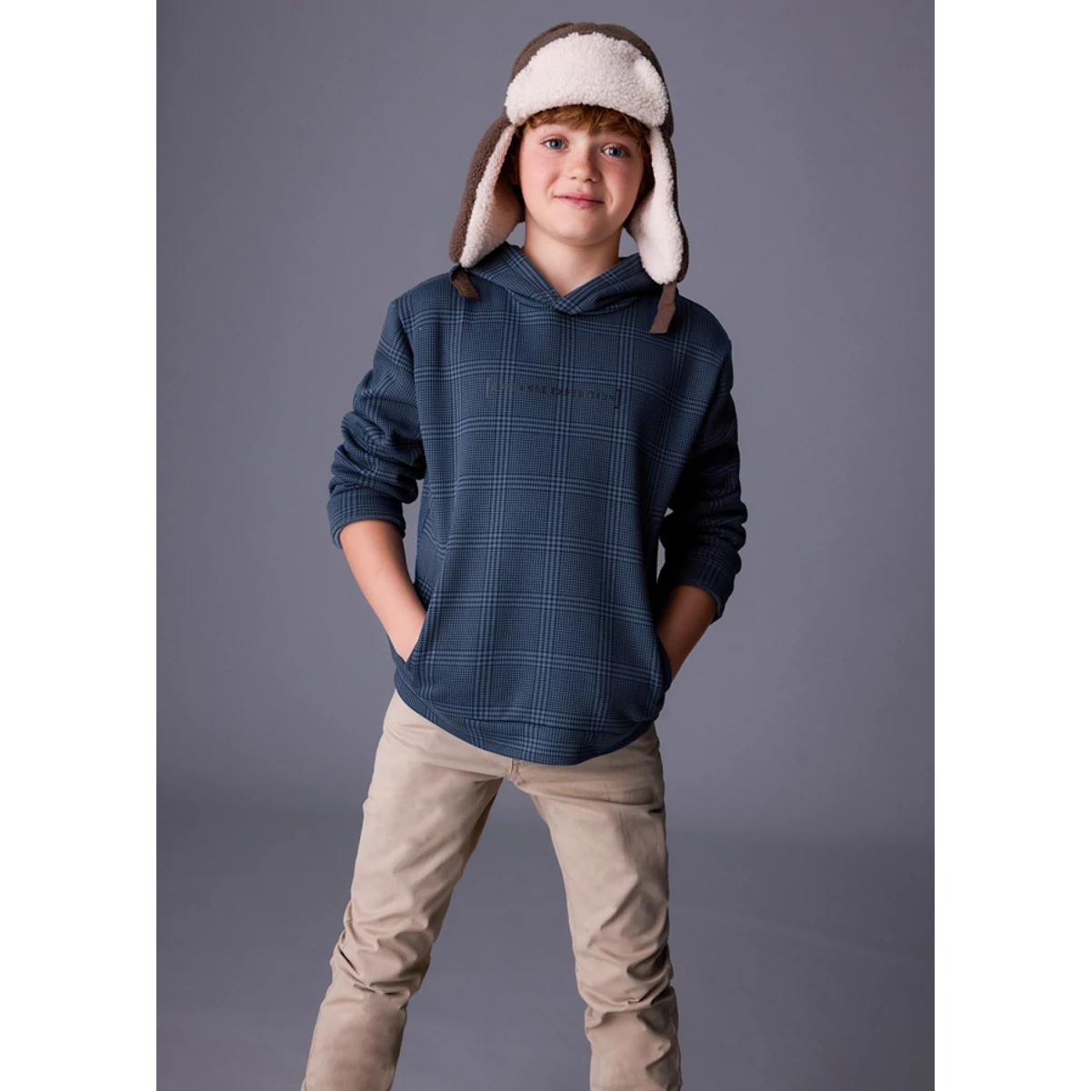 | Mayoral kockás kapucnis pulóver rugalmas pamut anyagból, elöl zsebekkel, apró felirattal, passzéval az ujjain és derekén belül bolyhos béléssel. Sportosan csinos pulóver őszre-télre. | |