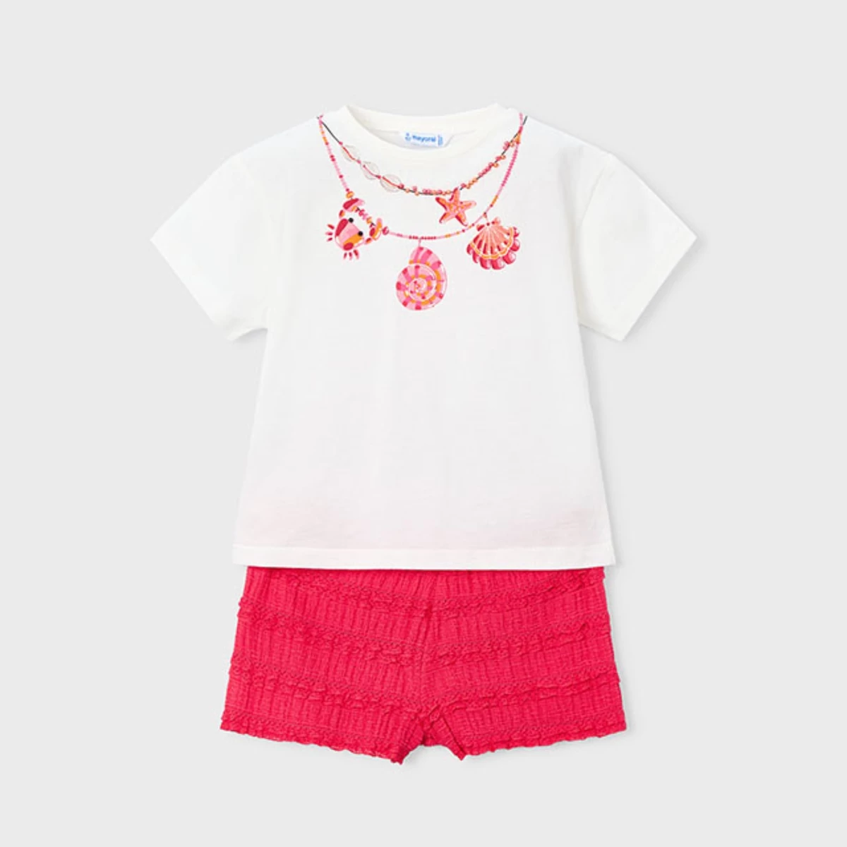 Mayoral kétrészes nyári szett, ami egy elöl nyomott tengeri mintás ( nyaklánc hatású ) rövid ujjú felsőből áll, és egy különleges anyagú végig fodros elasztikus gumírozott derekú rövidnadrágból áll. 2026 NYÁR