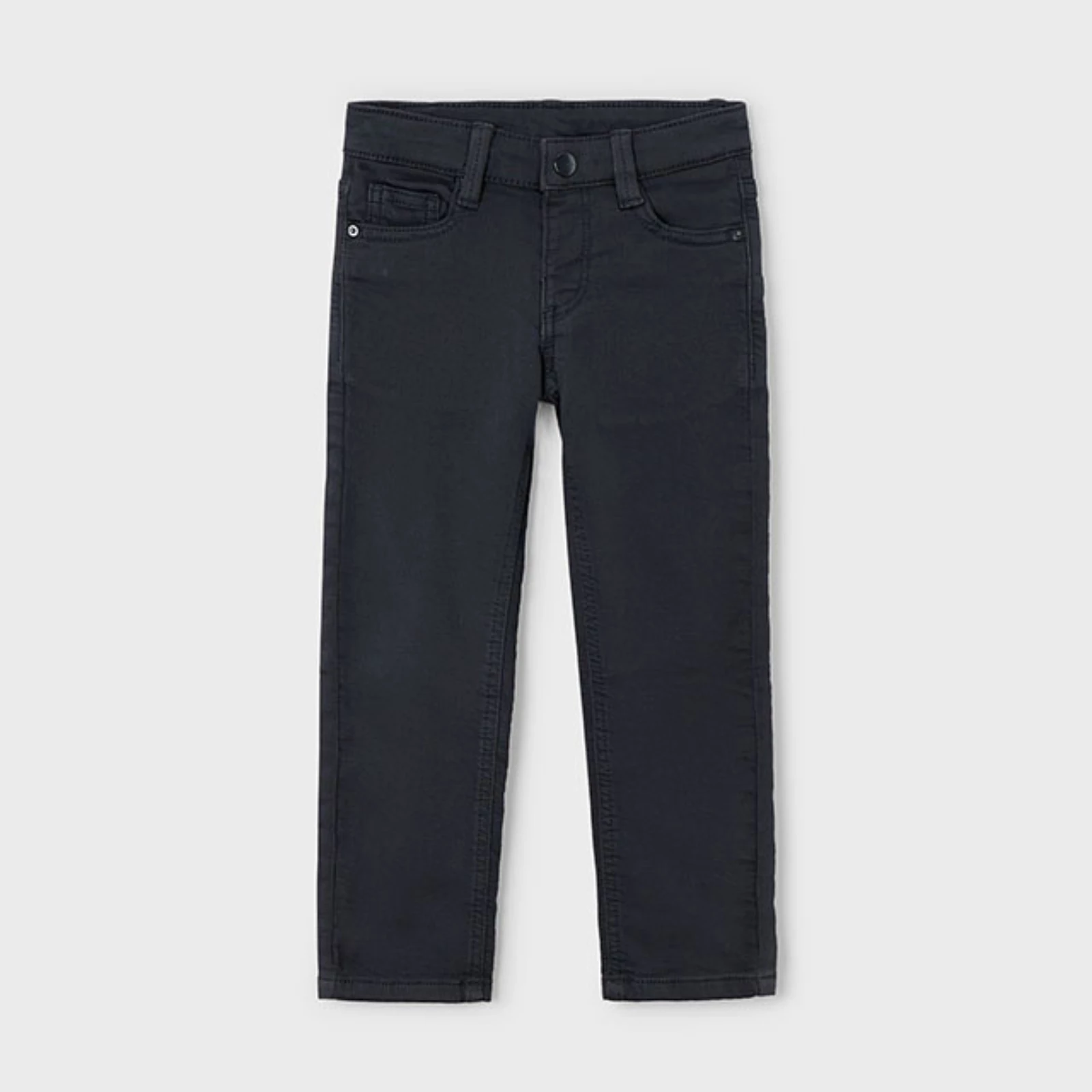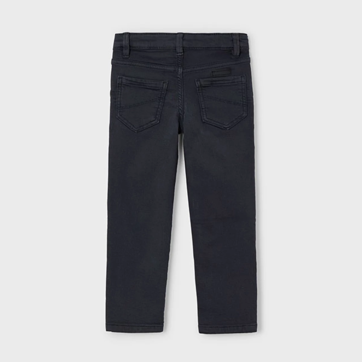 Mayoral soft ( puha anyagú) vastagabb anyagú egyenes szárú farmernadrág állítható derékrésszel, enyhén rugalmas anyagból, patenttal zárható, elöl-hátul zsebekkel Szuper kényelmes és csinos őszi-téli nadrág. Nagyon sötétszürke-fekete színű.