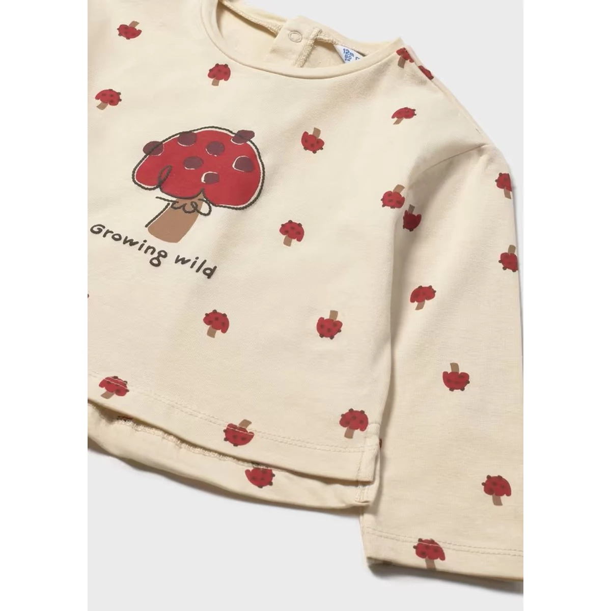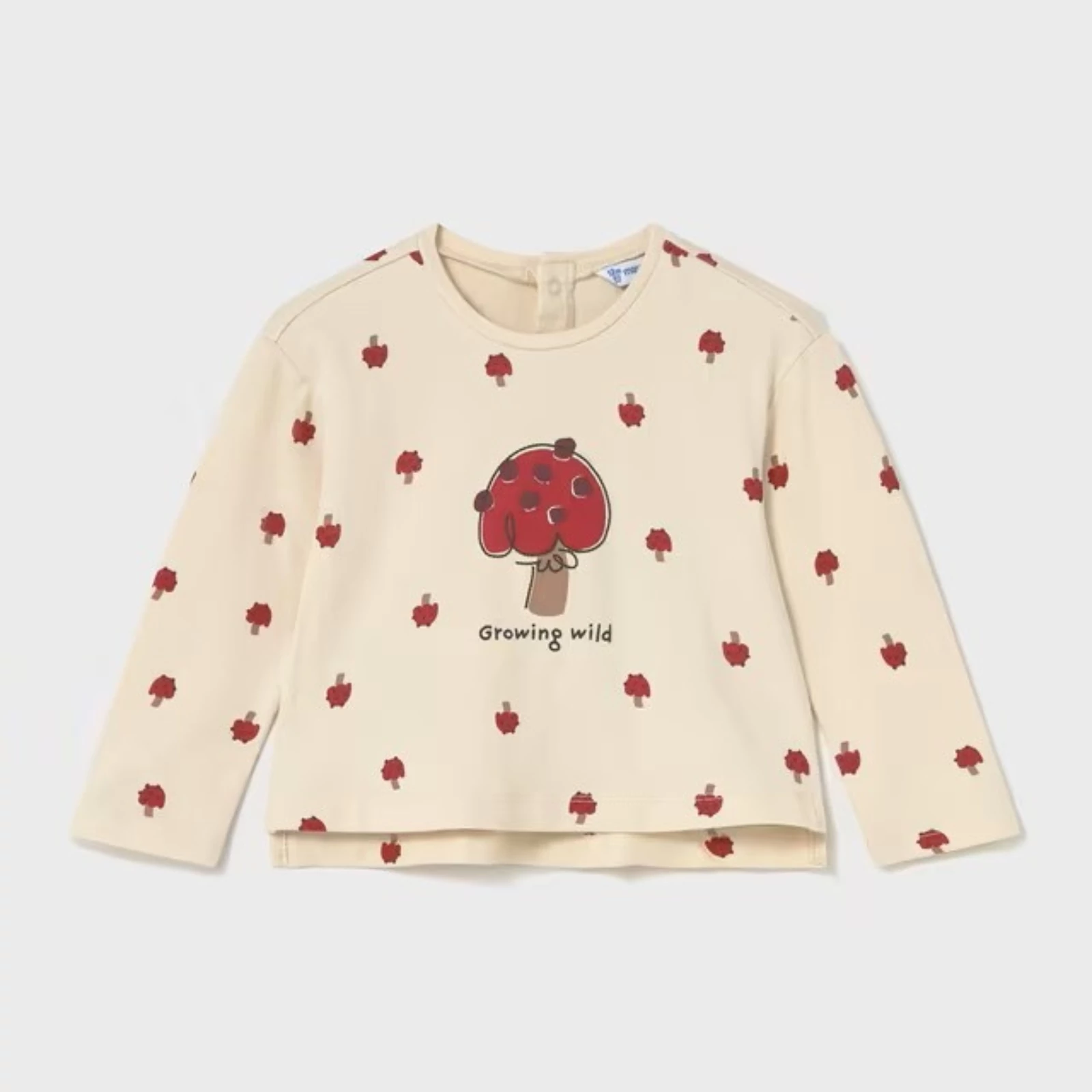 Mayoral cuki piros gomba mintás hosszú ujjú felső, extra rugalmas pamut anyagból készült, hátán 1 gombbal záródik. 2025 TÉL