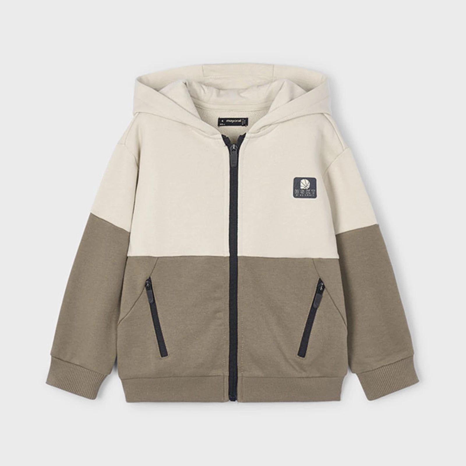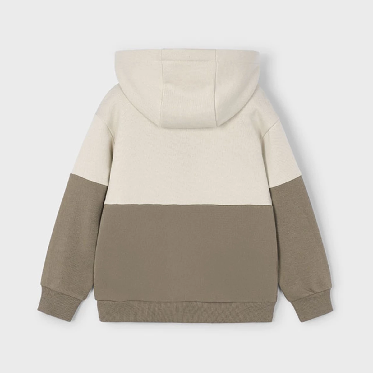 Mayoral kétszínű, sportos cipzáras pulóver kapucnival zsebekkel, pamut passzéval az ujjain és derekán, enyhén rugalmas puha pamutból készült, belül bolyhos béléssel. 2025 TÉL